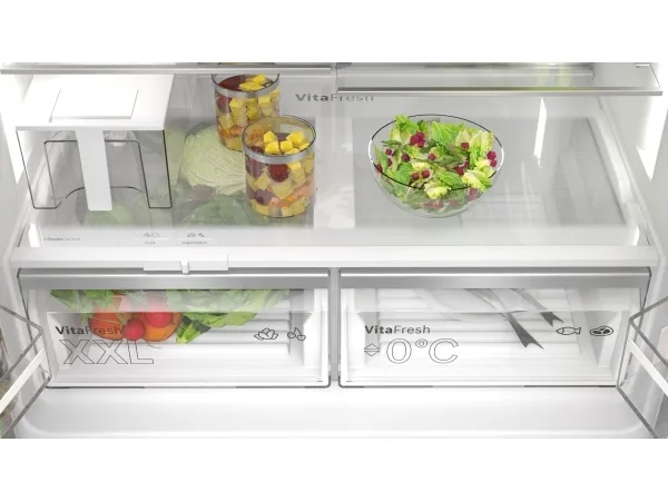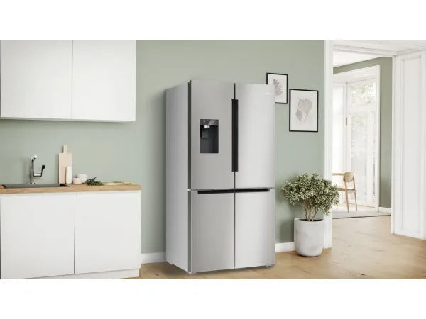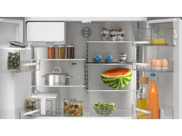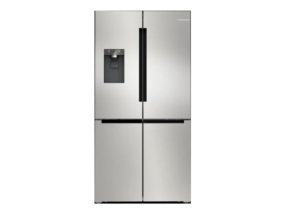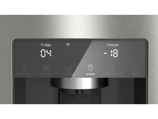 The Bosch Serie | 6 KFI96APEA offers a modern and efficient solution for food storage with a spacious design. This freestanding refrigerator/freezer features a combined total net capacity of 574 liters, allowing ample room for fresh produce and frozen goods. Equipped with a frost-free cooling system, it ensures optimal temperature maintenance while minimizing ice buildup, providing convenience for busy households. The electronic touch controls located on the door enhance user experience by ensuring easy access to settings and alerts.