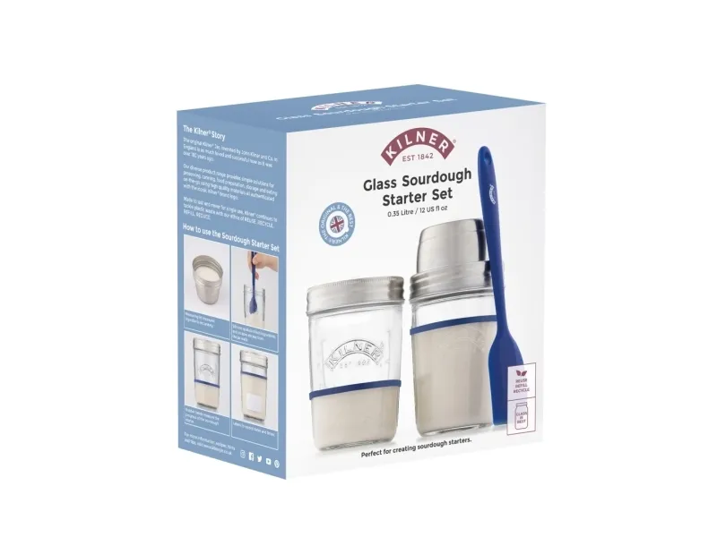 Kilner® Surdegs start Set innehåller all utrustning du behöver för att göra färska och läckra hemgjorda surdegsbröd. Surdegsbrödtillverkning har aldrig varit mer populär och du är inte bara begränsad till bröd, du kan också göra pannkakor, pizza, tortillor och bakverk med en surdegsstarter. Förpackad i presentförpackning