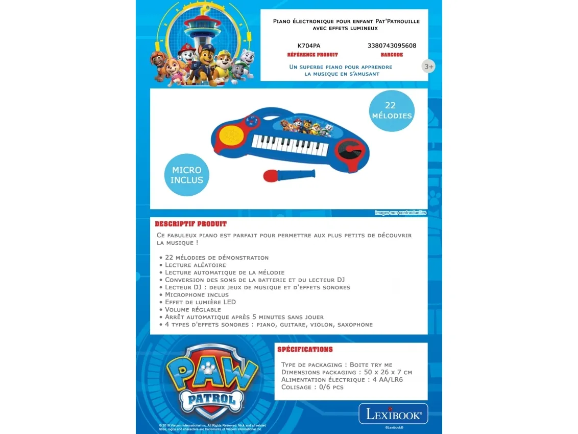 Lexibook Paw Patrol K704PA, Musikinstrument leksak, Piano, 3 År, AA, 468 g, Multifärg