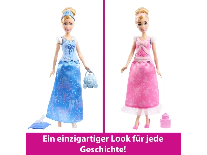 Disney Princess 2-in-1 Stories Cinderella fashion doll set is inspired by favourite moments from the classic Disney movie! Posable Cinderella doll features two distinct looksgoing to the ball or celebrating a birthdayand include two easy-to-use, snap-on bodices; two soft skirts; and nine themed accessories. It's the perfect gift for Disney fans eager for more Cinderella stories! Doll cannot stand alone. Colours and decorations may vary.Disney Princess 2-in-1 Stories Cinderella Fashion Doll with 2 Snap-On Bodices, 2 Skirts & 9 Accessories. Doll type: Fashion doll, Doll's gender: Female, Recommended age (min): 3 yr(s), Suggested gender: Boy/Girl. Height: 293 mm, Weight: 40 g. Material: Fabric, Plastic, Product colour: Multicolour