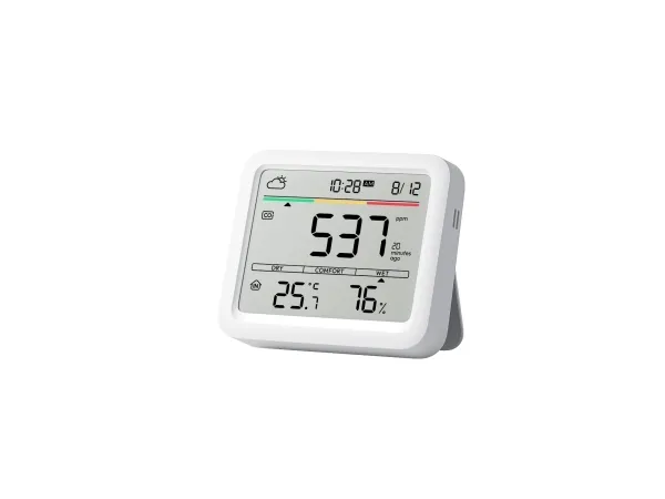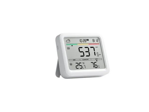 6 IN 1 MULTI-FUNCTION SCREEN SwitchBot Meter Pro CO2 has a large screen that simultaneously displays CO2 levels, temperature, humidity, time, date, comfort level and weather forecasts (SwitchBot hub required). This makes it easy to monitor your environment and decide when to ventilate to create a healthier habitat. HIGH PRECISION SENSOR SwitchBot CO2 meter is equipped with Swiss industrial grade NDIR sensors and monitors air quality by measuring CO2 levels every 1 second with an accuracy of ±50ppm and a range of 400-9999ppm. Its high sensitivity and stability ensure fast and precise feedback on air quality. Multiple alarm methods: adjust the CO2, temperature and humidity range with trigger warnings. If the limits are exceeded, you will be notified of acoustic alarms, visual screen alerts and app notifications (SwitchBot hub required). So you can effectively monitor the air quality at any time. Part of the SwitchBot Ecosystem: With Hub 2, exceeding CO2 levels can automatically activate your battery circuit fan or evaporative humidifier for improved ventilation. Hub 2 also enables third-party voice control, simplifying air quality management. Portable & Durable Our air quality detector measures 3.6 x 3.1 x 0.9 and weighs only 5.4 oz. It has a built-in battery with a service life of up to 12 months and a low battery warning. It features wall mounting holes and an adjustable bracket for versatile placement in any environment.