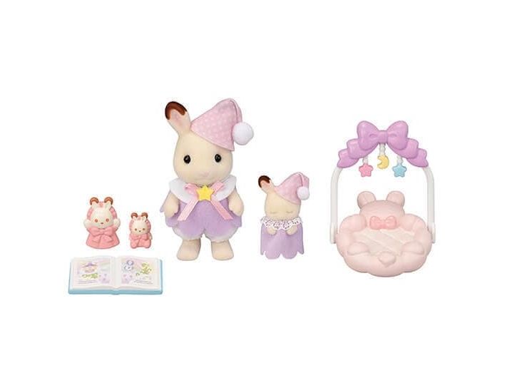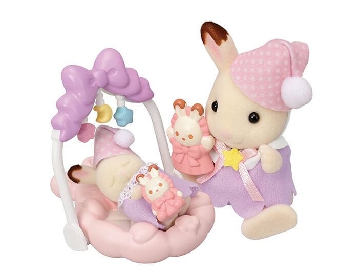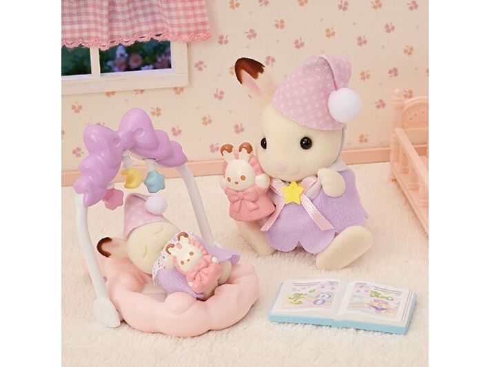 The set contains two figures Chocolate Rabbit girl Freya and cradled baby Flora. Bedtime is fun with this set that includes a baby gym and matching accessories. The adorable baby gym with a mobile will lull the cradled baby to sleep. The Chocolate Rabbit cradled baby has her eyes closed because she is sleeping. The girl and cradled baby are wearing matching pajamas with night caps. The puppet can be placed on the girl's hand. Combine with other figures, houses, and furniture (sold separately) for even more fun imaginative playtime! Suitable for ages 3+.