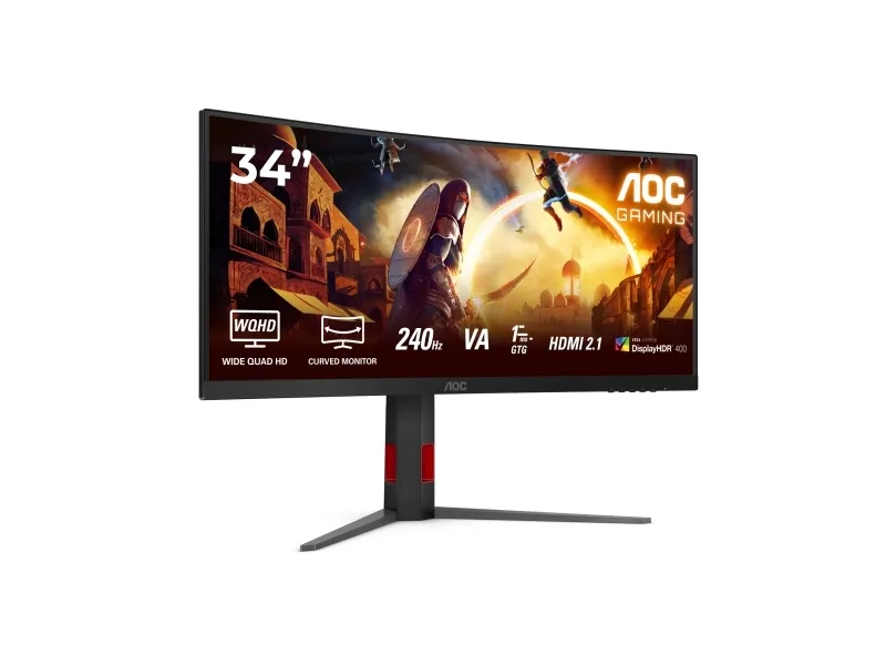 Take your gaming to the next level with the CU34G4Z 34" WQHD curved monitor. Enjoy ultra-smooth gameplay with a 240Hz refresh rate and 1ms GtG response time. The 1500R curved Fast VA panel provides immersive visuals, while HDR400 enhances color and contrast. Equipped with an ergonomic stand, USB hub, and G-Menu software for customizable settings, this monitor is designed for gamers who demand precision and comfort.AOC G4 CU34G4Z. Display diagonal: 86.4 cm (34"), Display resolution: 3440 x 1440 pixels, HD type: Wide Quad HD, Display technology: LED, Response time: 1 ms, Native aspect ratio: 21:9, Viewing angle, horizontal: 178°, Viewing angle, vertical: 178°. Built-in USB hub, USB hub version: 3.2 Gen 1 (3.1 Gen 1). VESA mounting, Height adjustment. Product colour: Black, Red