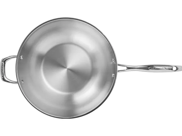 32 cm wok i blankt rustfrit stål med unikt kantdesign. Bunden har en afrundet form og består af rustfrit stål med en kerne af aluminium som varmeleder. Wokken har to greb og leveres uden låg.