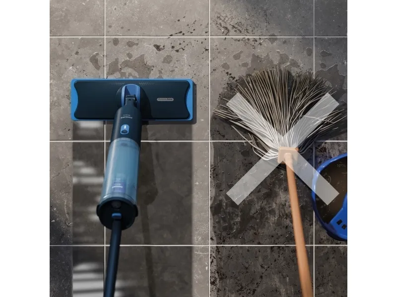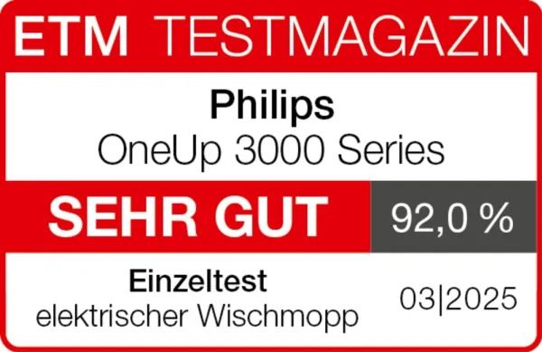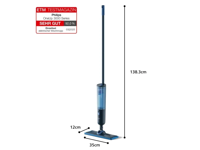 Goodbye old mop, hello OneUp! Say goodbye to traditional mops that spread dirt! The Philips OneUp Electric Mop delivers 2 x cleaner floors twice as fast***. It sucks up dirty water while pumping clean water onto the floor for a spotless shine.Philips OneUp 3000 Series Electric Mop. Type: Cordless mop, Dirty water tank capacity: 0.27 L, Product colour: Blue. Runtime: 50 min. Width: 350 mm, Depth: 120 mm, Height: 1420 mm. Quantity per pack: 1 pc(s)