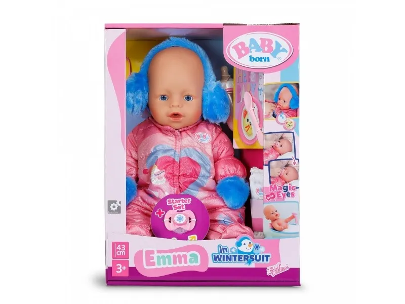 BABY born Emma ger massor med skojiga lekar i barnkammaren med sina 10 verklighetstrogna funktioner. Hon kan dricka, bada, potträna, blunda när nappen vrids och mycket mera. Hon äter från sin lilla tallrik där maten på ett magiskt sätt blir synlig. Jag undrar vad som ligger på hennes tallrik i dag? Förutom den magiska tallriken och pottan kommer hon med massor av tillbehör för att göra den klassiska dockteatern kreativ och rolig. Från 3 år.