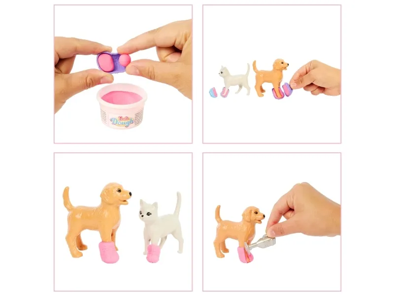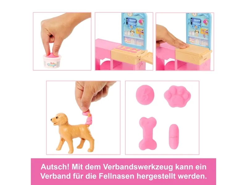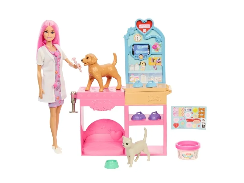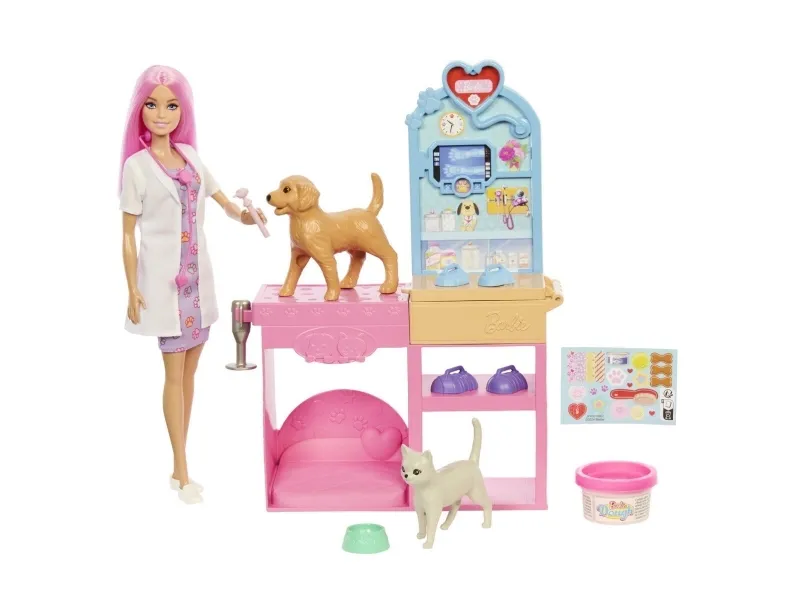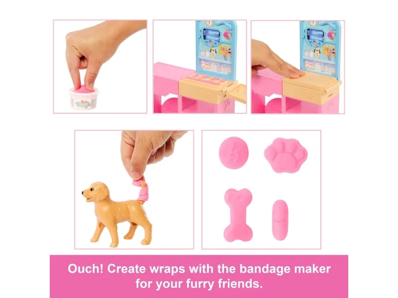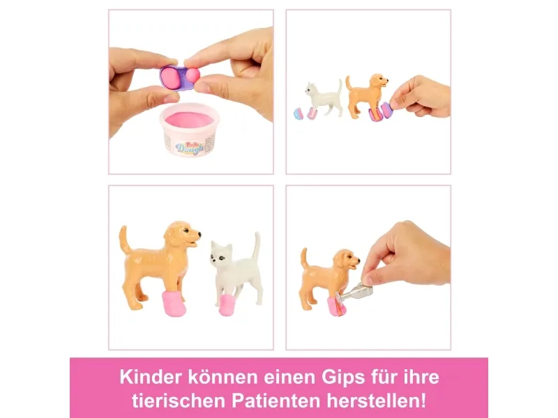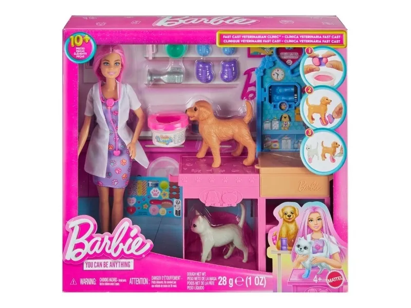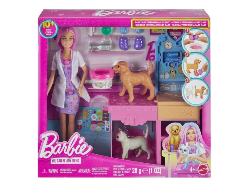 Explore a world of animal caretaking fun with the Barbie Fast Cast Veterinarian Clinic playset! When girls play with Barbie, they imagine everything they can become, and for those that love taking care of their furry friends, they can become Veterinarians! The clinic includes a pink hair Barbie doll, 2 pets, an exam table, and vet accessories! Kids can make casts for their animal patient with a realistic cast making feature to create casts for the patient's legs and create wraps with the bandage maker! Kids will love bringing their animal friends to the clinic and back to good health! Doll cannot stand alone. Colours and decorations may vary. Makes a great gift for ages 4 and up.Barbie Fast Cast Veterinarian Clinic Playset with Pink Colored Hair Fashion Doll, Vet Furniture & 10+ Accessories. Doll type: Fashion doll, Doll's gender: Female, Recommended age (min): 4 yr(s), Suggested gender: Boy/Girl. Height: 285.7 mm, Weight: 400 g. Material: Fabric, Plastic, Product colour: Multicolour