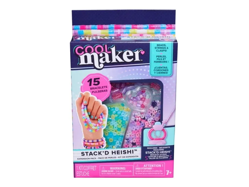 Includes: 1300 Heishi Beads, 40 Feature Beads, 18 Strings, 17 Clasps (in 2 Parts)Cool Maker , Stack’d Heishi Expansion Pack Bead Kit, Bracelet Making Kit with over 1300 Beads for Bracelets, Makes 15, Gifts & Stocking Stuffers for Girls Ages 7 and up. Product type: Children's jewellery bracelet making kit, Recommended age (min): 7 yr(s), Product colour: Multicolour. Package type: Window box
