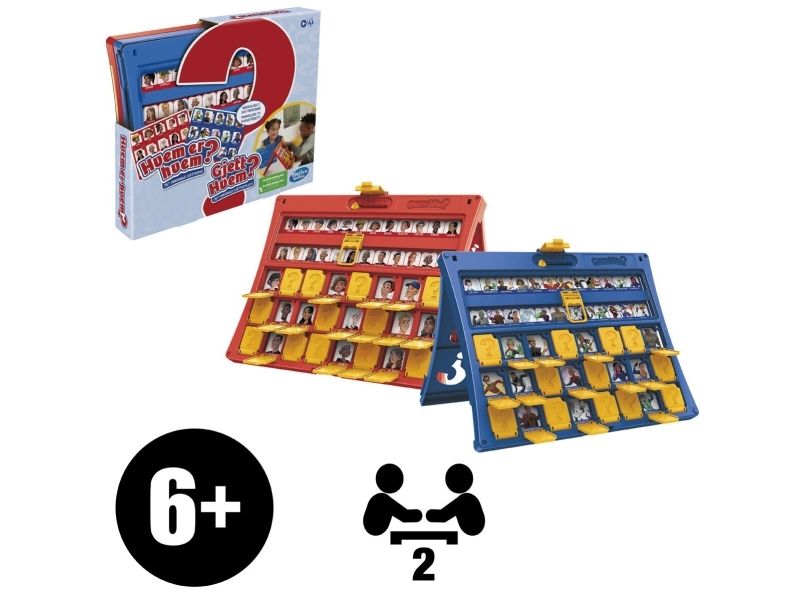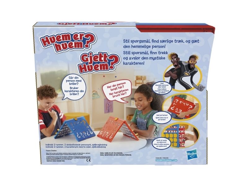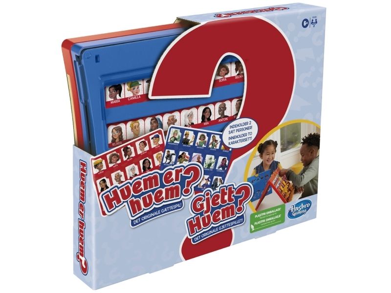 Väck barndomsminnen till liv med det klassiska Vem där?-spelet och visa dina barn och barnbarn den här versionen av det klassiska gissningsspelet. Med Vem där?-sällskapsspelet väljer varje spelare ett kort med en hemlig figur och använder ja- och nej-frågor för att lista ut vem den andra spelarens hemliga figur är. Spelet inkluderar två dubbelsidiga figurark, inklusive ett med superhjältar. Figurarken kan enkelt sättas i och tas ut ur ramen, så det är enkelt att förbereda spelet. Och det är lätt att ta med sig spelet på språng i den smidiga ihopfällbara kartongen. Vem där?-spelet för två spelare är en suverän inomhusaktivitet för barn från 6 år. Hasbro Gaming och alla relaterade namn är varumärken som tillhör Hasbro.