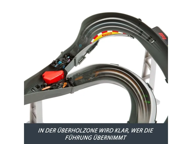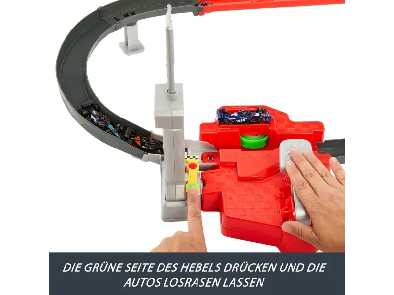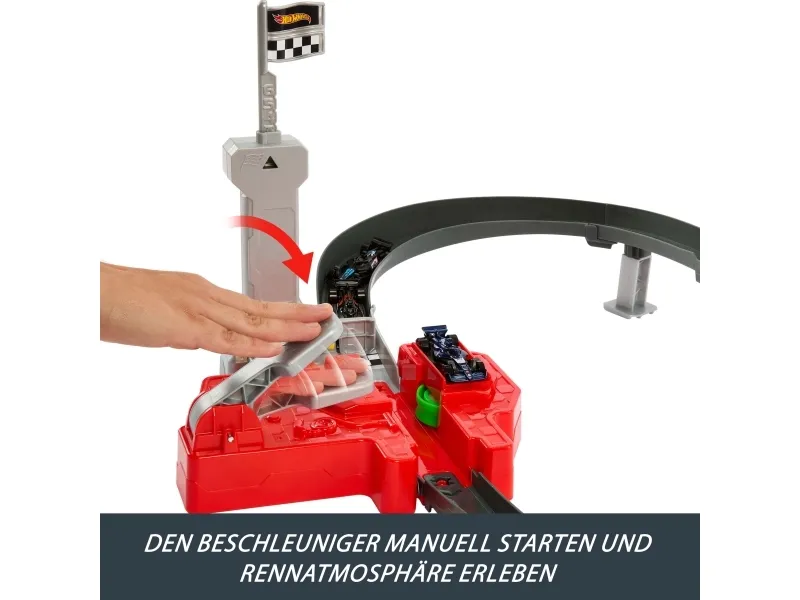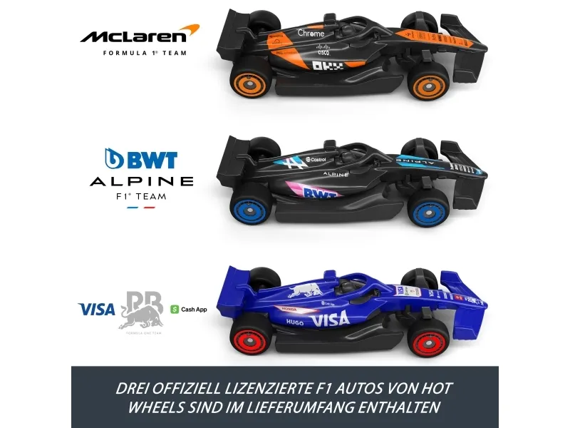2 sätt att leka på. 3 Formel 1 Hot Wheels-bilar medföljer.