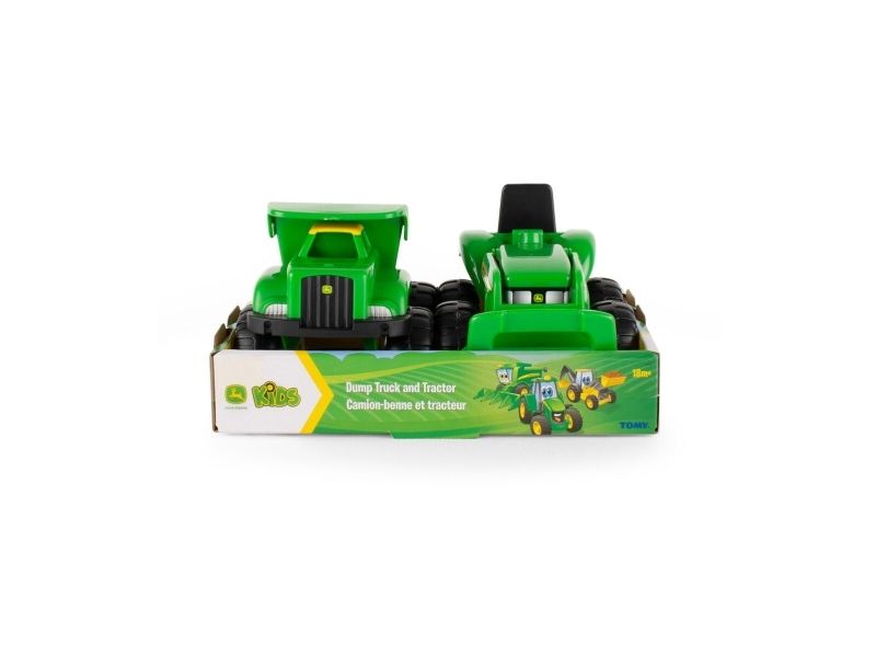 Detta fantastiska set med två olika fordon är perfekt för lek både inomhus och utomhus. Traktorn har en fungerande frontlastare som kan tippas både framåt och bakåt så att man kan skopa upp och lassa av. Tippvagnen har plats för stora laster och är utrustad med en enkel tippfunktion. Båda fordonen har stora rullande hjul och är gjorda av tålig plast som är gjord för att hålla.