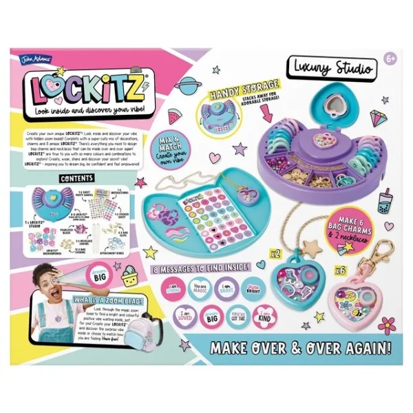 Skapa 8 fantastiska Lockitz, som passar perfekt till din stil! Fyll dem, lås dem och njut av dem! Se igenom den magiska zoom-pärlan och hitta en ljus och färgstark positiv energi som väntar på dig därinne! Mixa och matcha supersöt dekorationer och skapa dina personliga accessoarer som du kan bära och dela med andra. Det finns så många färger och kombinationer att utforska! Settet innehåller allt det som du behöver för att designa 6 vackra smycken till väskorna och 2 halshand som du kan göra om och om igen! Innehåller förvaras snyggt och prydligt i den praktiska Lockitz Luxury Studio. Från 6 år.