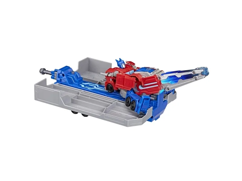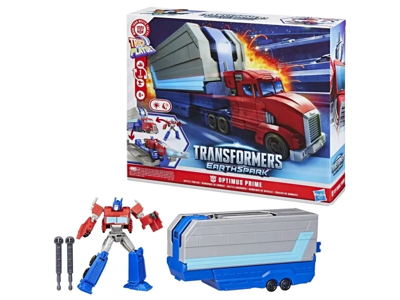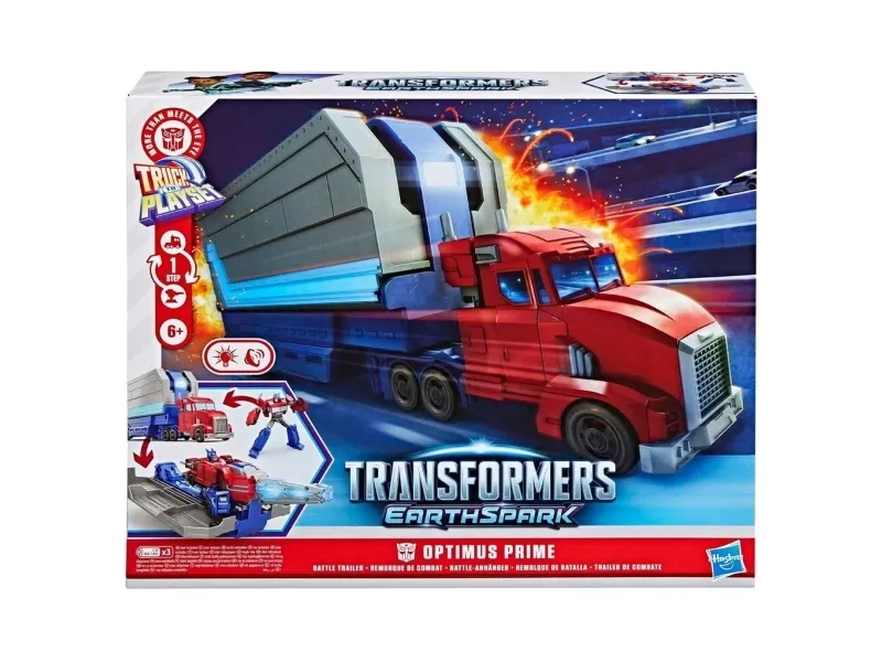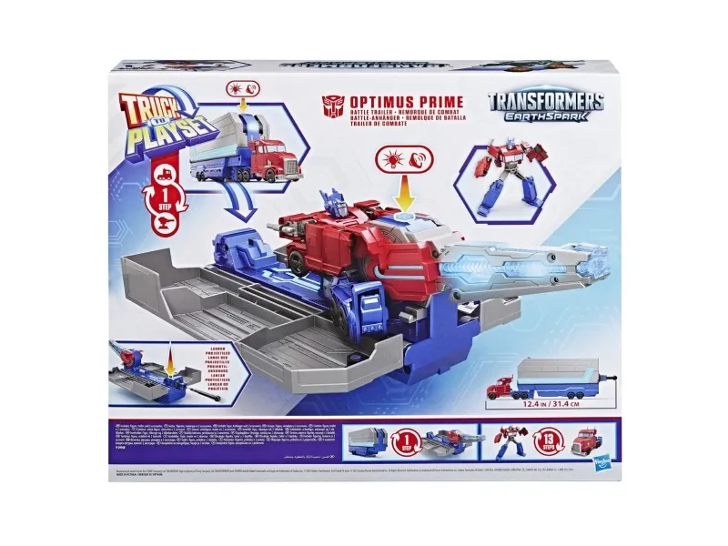 Get ready to roll into battle with the Transformers Optimus Prime Battle Trailer playset! There are so many ways to play with this awesome Transformers toy. Put the 5-inch (12.5 cm) Optimus Prime figure into toy truck mode, then attach the playset in trailer mode and roll out! Then, convert the Optimus Prime action figure into robot mode and flip the blaster on the playset to see it open up into a battle station. The figure can sit in the battle station and man the light-up blaster or the projectile launcher. Kids can load a projectile into the launcher and launch it with the press of a button! With lights and unique sounds in each mode, kids can feel like part of the exciting action of the Transformers: EarthSpark show. Electronic toys like the Optimus Prime Battle Trailer make great gifts for boys and girls 6 and up who love Transformers figures and toy cars. TRANSFORMERS and HASBRO and all related trademarks and logos are trademarks of Hasbro, Inc.