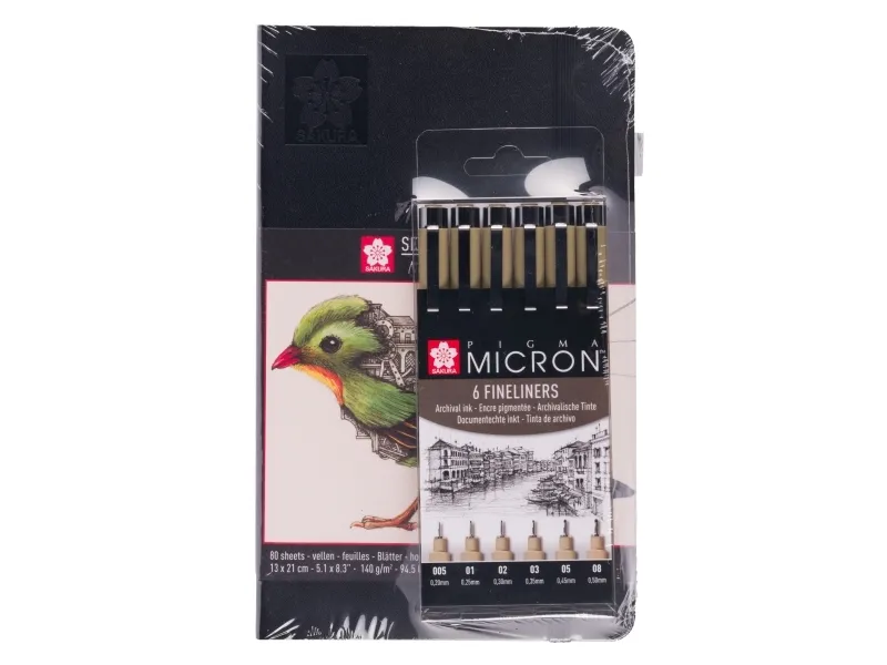 This set includes a Sakura notebook with 80 cream colored sheets and a set of six black Pigma Micron fineliners. ?