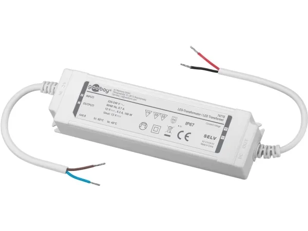transformator för konstant spänning (CV) för utomhusbruk, ej dimbar Robust LED-transformator utan minimibelastning för anslutning av ljuskällor som G4- eller GU 5.3 LED-spots, LED-strips och LED-moduler till 220-240 V (AC)-nätet Den konstanta spänningen på 12 V (DC) gör det möjligt att på ett flexibelt sätt lägga till och ta bort enskilda lysdioder i parallella kretsar och variera längden på LED-remsor Med IP67 är LED-drivdonet perfekt för utomhusbruk, t.ex. för utomhusbelysning, övervakningssystem, fuktiga rum som badrum eller kök och industriella fuktiga rum Idealisk för strömförsörjning av flera lysdioder eller LED-remsor samtidigt med en total uteffekt på upp till 100 W Ingång och utgång för 12 V LED-transformator vardera med 20 cm lösa kabeländar (2-poliga) för förenklad installation LED-drivern är särskilt säker tack vare överspännings- och kortslutningsskydd samt elektronisk isolering i enlighet med skyddsklass II Mått (L x B x H): 193 x 52 x 37 mm, Obs: LED-transformatorn är inte dimbar