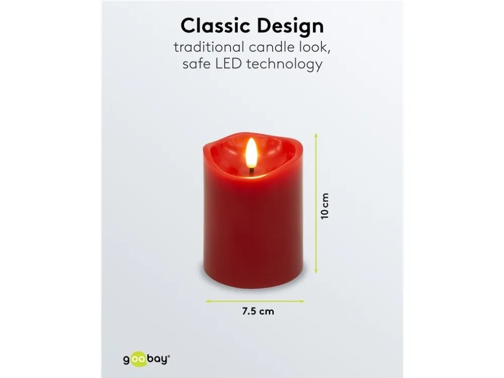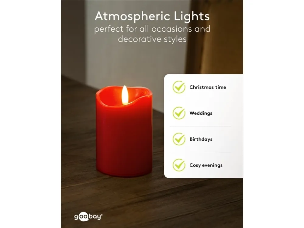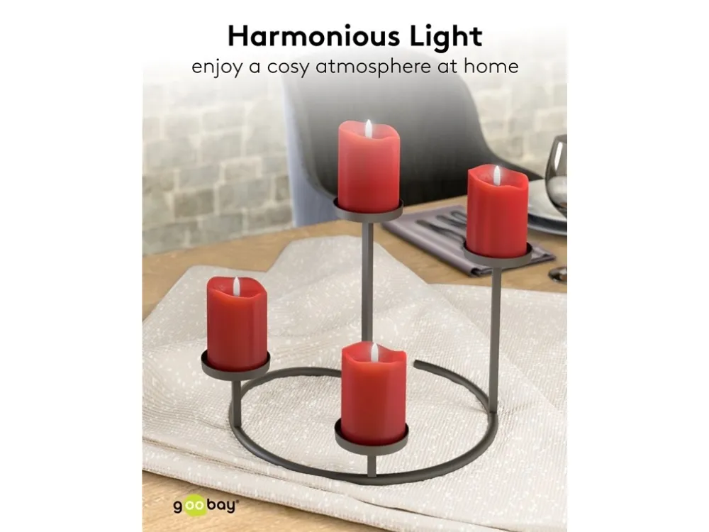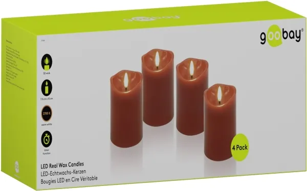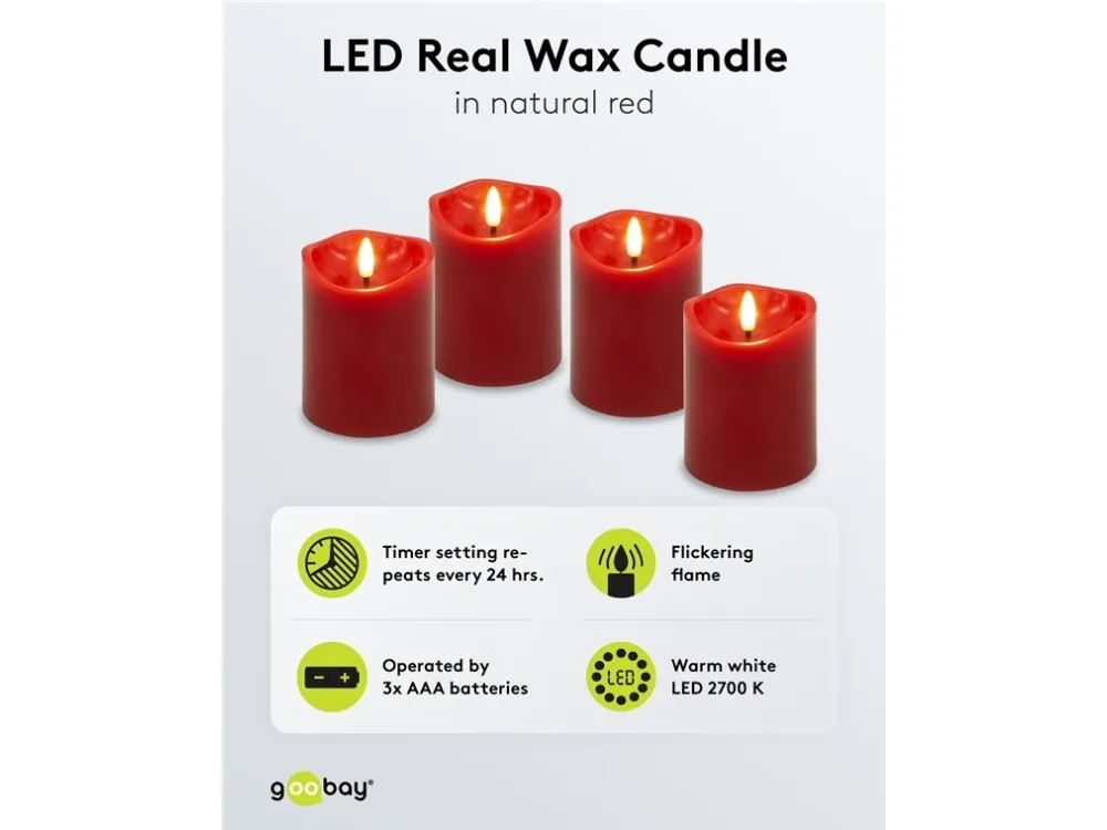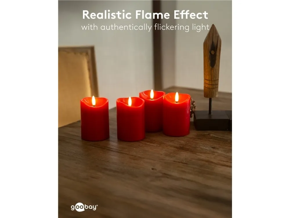 Fyra blockljus i samma storlek med 3D-flammor för ett varmt ljussken med en naturlig, fladdrande låga – helt elektriskt och helt säkert