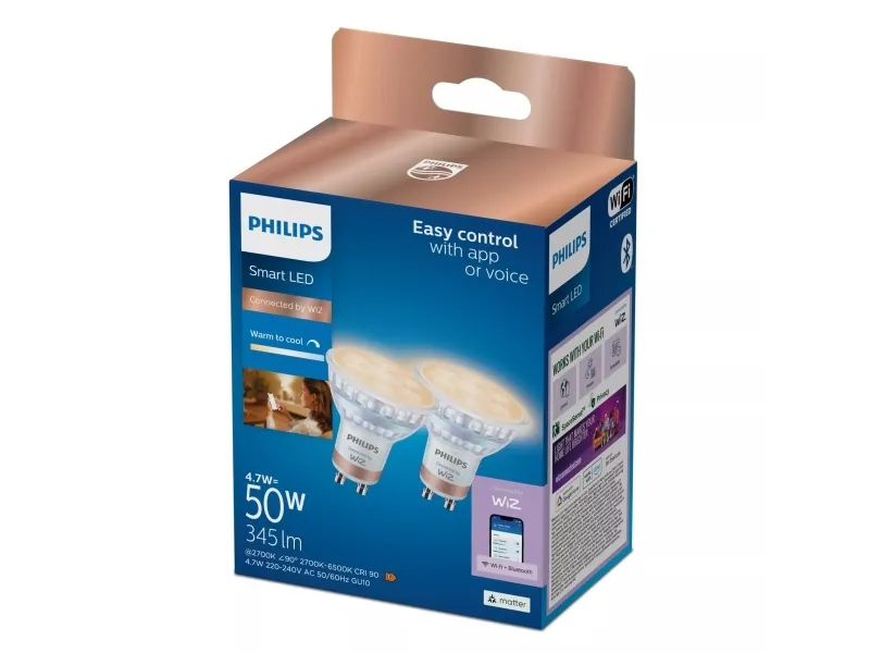 Philips Spot 50 W PAR16 GU10 x2, Smart glödlampa, Wi-Fi/Bluetooth, Vit, GU10, PAR16, 2700 K