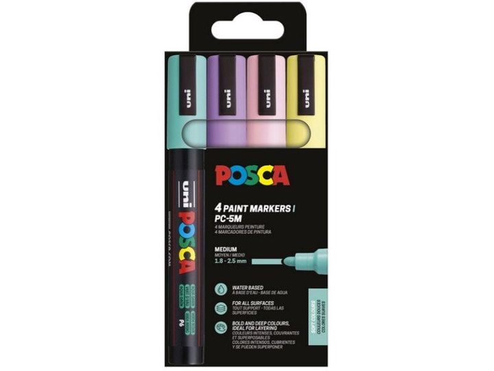 POSCA pigmentmarker PC-5M, mjuka färger, 4-pack, linjebredd: 1,8 - 2,5 mm, vattentät, ljus- och vattentålig - 1 st (PC5M/4APF ASS75)