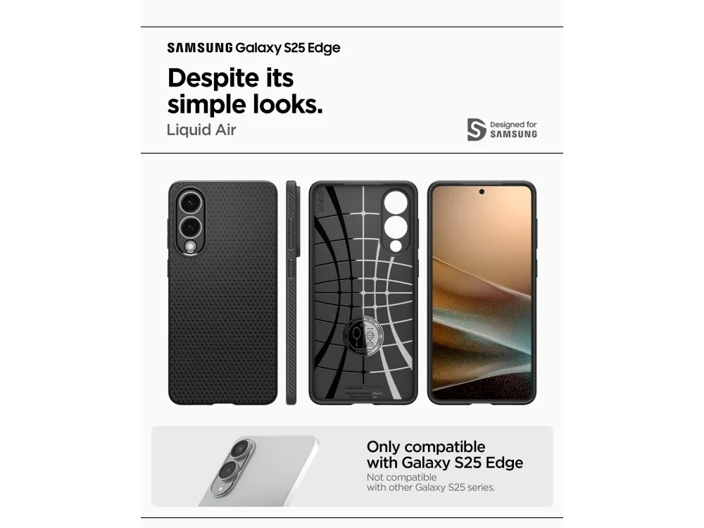 Spigen Liquid Air Galaxy S25 Edge Case Matte Black. Case type: Cover, Brand compatibility: Samsung, Compatibility: Galaxy S25 Edge, Maximum screen size: 17 cm (6.7"), Surface coloration: Monochromatic, Product colour: Black
