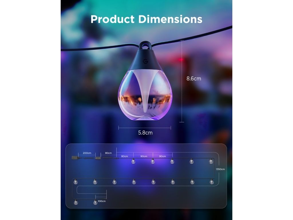 Govee H7025 ljuskedja är mångsidig för utomhusmiljöer tack vare sin vattentäta och stöttåliga design. Den fungerar inom ett brett temperaturområde, från -20 °C till 40 °C, vilket gör den lämplig för olika förhållanden. Denna ljuskedja styrs via en app och är kompatibel med röstkommandon, vilket gör det enkelt att hantera belysningen. Med 111 scenlägen och 10 musiklägen ger den extra stämning till alla sammankomster och miljöer. Det varmvita ljuset avger 1200 lumen, vilket garanterar ljusstyrka samtidigt som energieffektiviteten bibehålls med en effekt på 24 W. Med en livslängd på 25 000 timmar garanterar denna belysningslösning långvarig njutning och anpassningsförmåga.