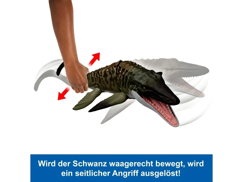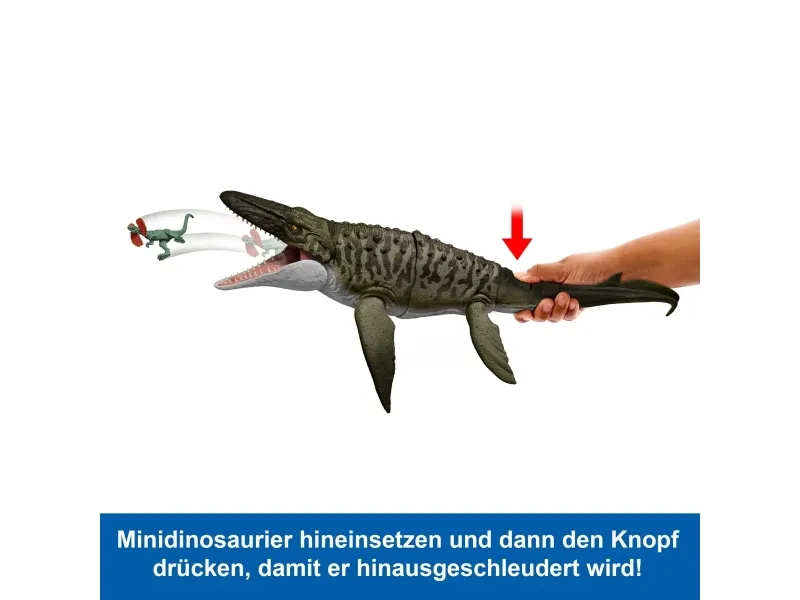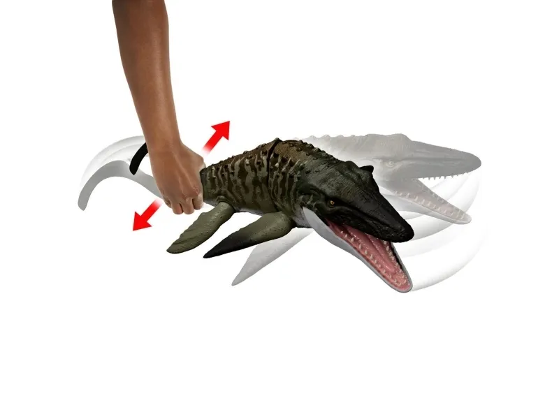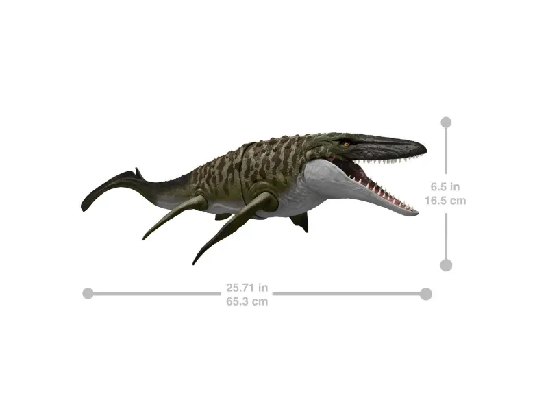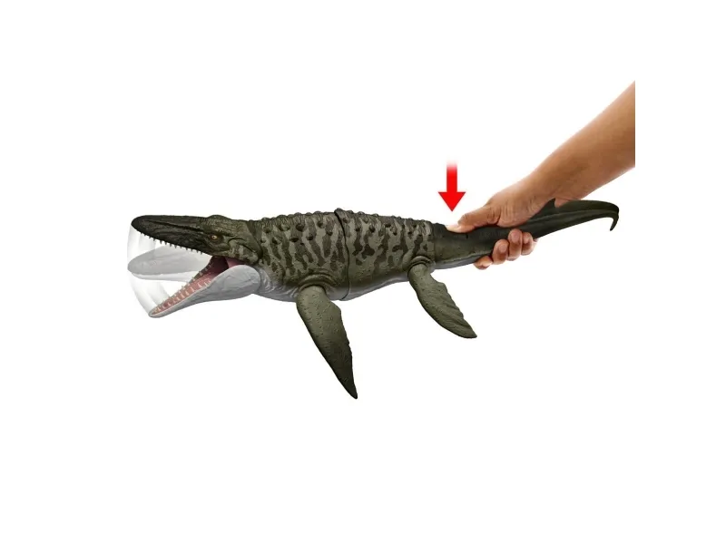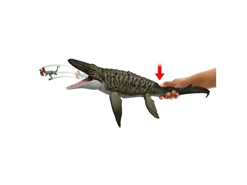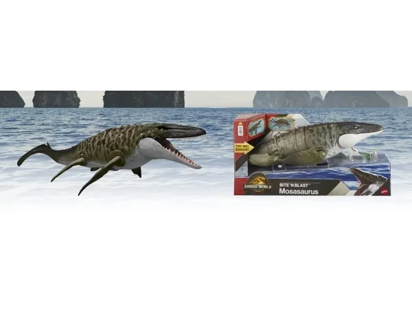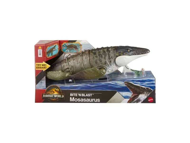 This Bite 'N Blast Mosasaurus dinosaur action figure with its distinctive aquatic design brings the excitement of Jurassic World Rebirth home. A button-activated 'Bite' feature allows dramatic re-enactment of movie scenes and inspires creative play. Kids can control the attack by holding the tail and pressing the button to make the jaw open wide to bite the mini Dilophosaurus figure that's included can be completely 'swallowed' into the large Mosasaurus body! Press the button again to 'Blast' the prey back out! With movable joints and movie-accurate design on the 25.7-inch long Mosasaurus, it's ready for both play and display. Scan the Tracking Code under the fin in the free Jurassic World Play App with a compatible smart device (Android or iOS, not included) to unlock a digital version of the dinosaur and play the fiercely fun game to race various vehicles on land, air and sea. Makes a great gift for dinosaur fans ages 4 years and up. Colours and decorations may vary.Jurassic World Rebirth Bite N Blast Mosasaurus Action Figure and Mini Dilophosaurus, Dinosaur Toy. Recommended age (min): 4 yr(s), Product colour: Green, Grey, Material: Plastic