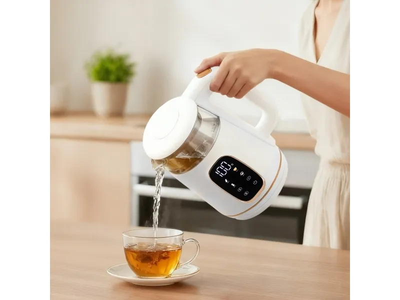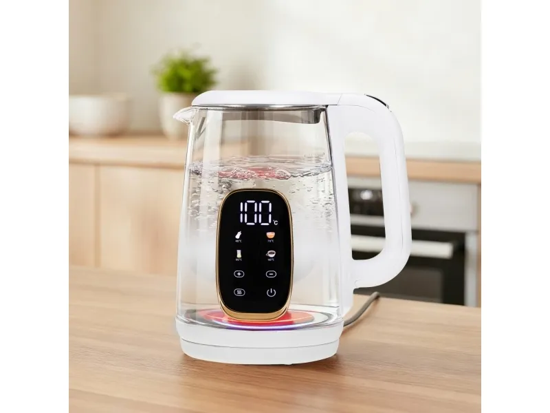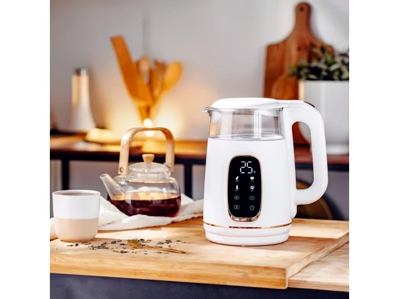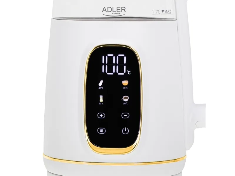 Max capacity: 1,7L. Temp. regulation 40-100°C. Color LCD temp. display.Plastic body with glass interior, Keeping warm function for 2h. Sediment filter, Swivel base 360 °, Water level indicator with scale.