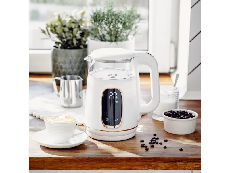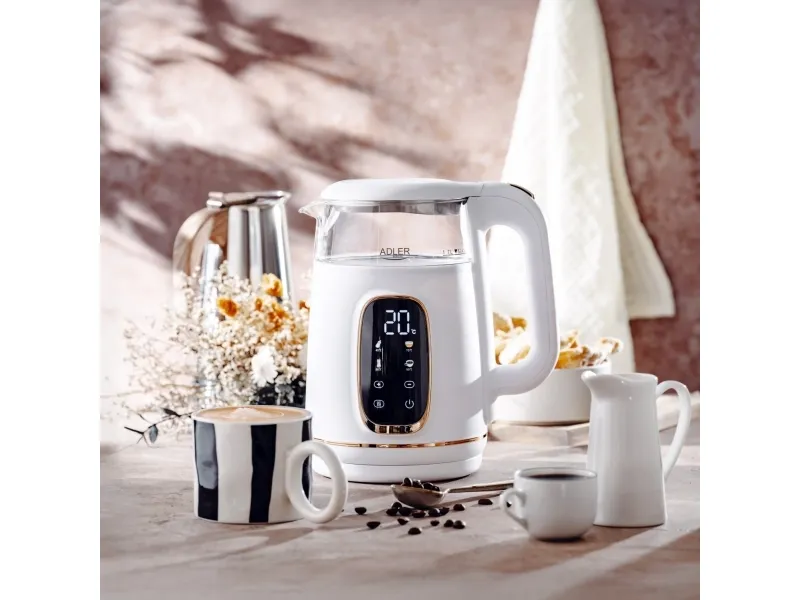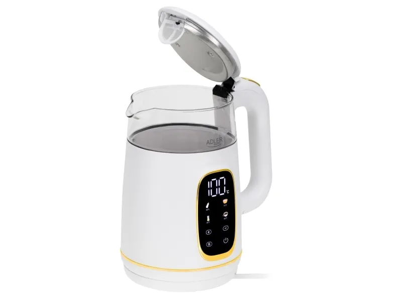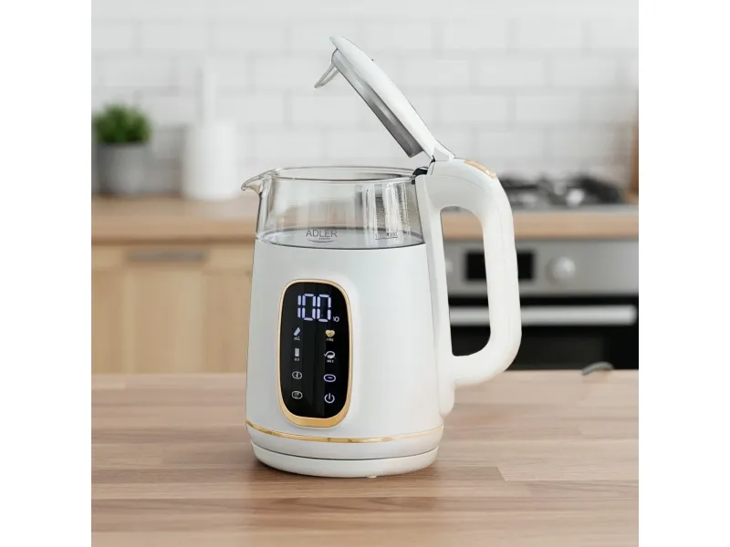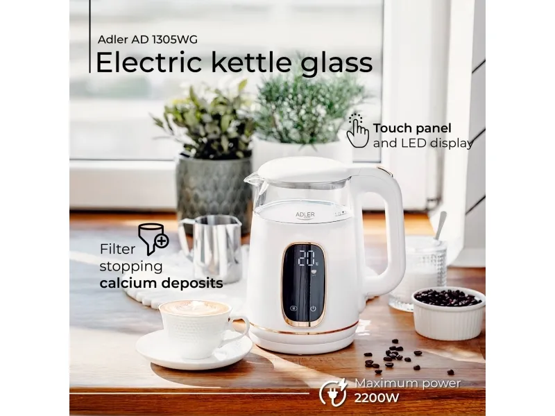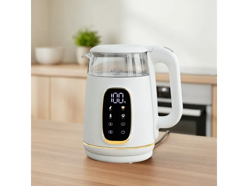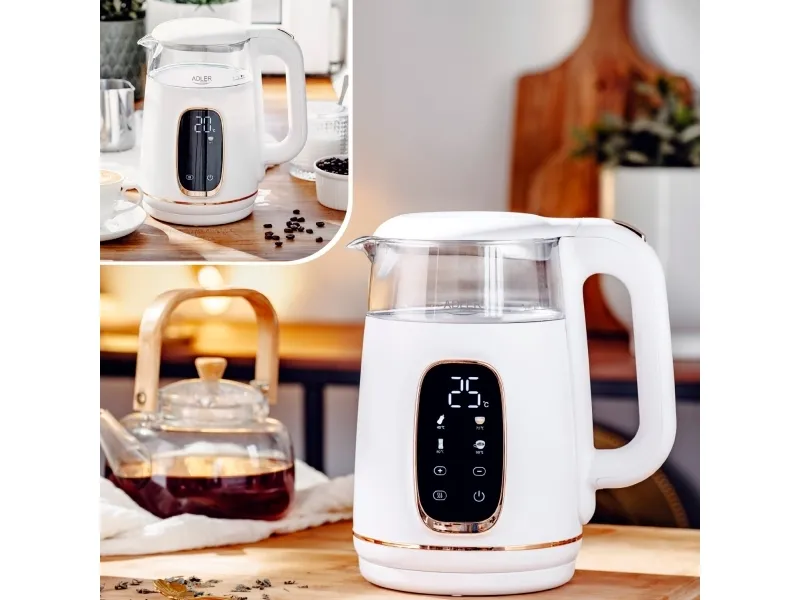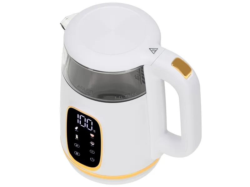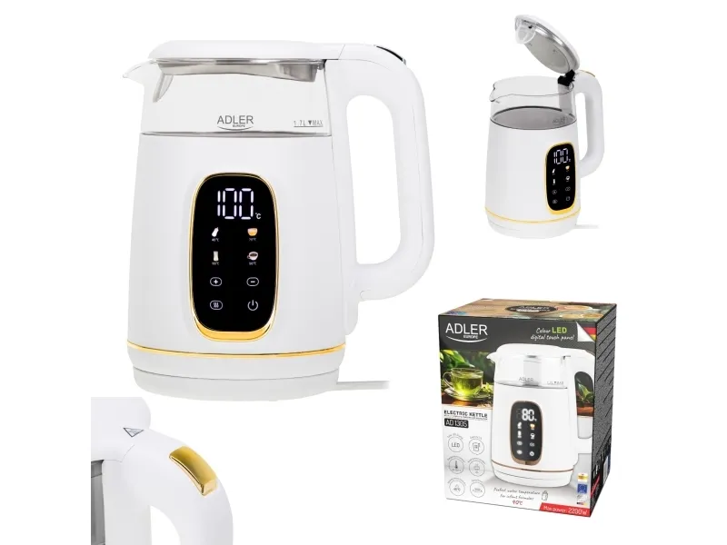 Adler AD 1305WG, 1,7 l, 2200 W, Transparent, Guld, Vit, Glas, Plast, Justerbar termostat, Vattennivå indikator