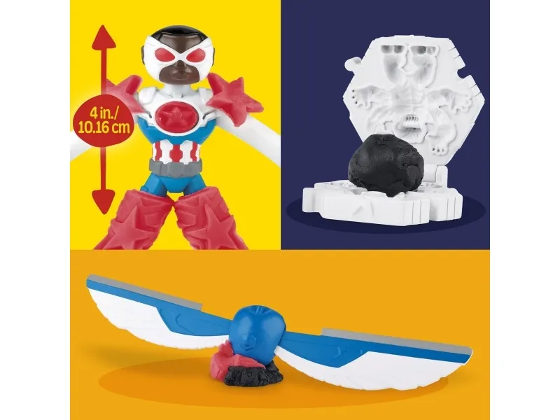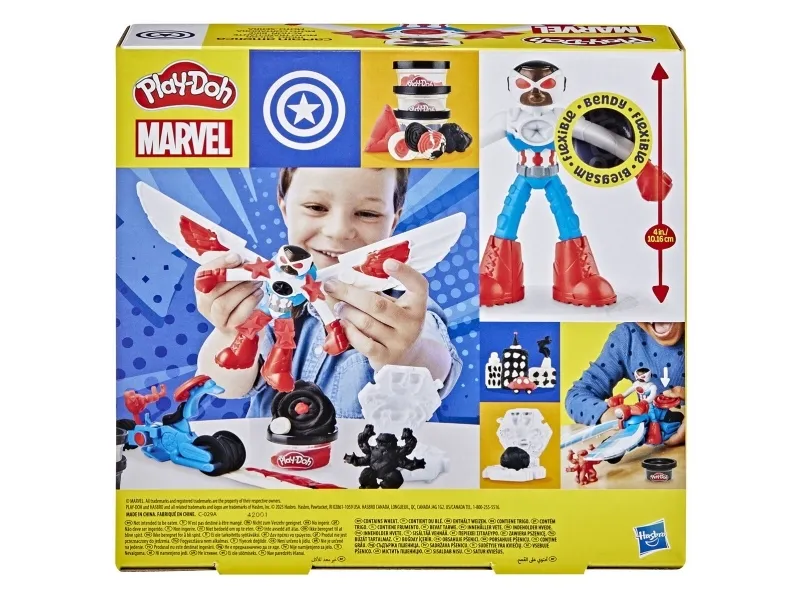 Fantasin räddar dagen med det här Play-Doh Captain America Moto-Slicer-leksetet! Det är lätt och roligt för barnen att skapa sina egna äventyr med sina favoritkaraktärer, som Captain America. Play-Doh Marvel-actionfiguren har böjbara, flexibla armar och ben som barnen kan anpassa med olika Play-Doh-tillbehör. 2-i-1-vingarna kan fästas på antingen figuren eller fordonet som ett skärverktyg. Skapa skurkar med bokformen som även har piggar på ovansidan för att visa upp actionfiguren. Tre burkar färgglad, klämvänlig Play-Doh-lera passar perfekt när barnen vill börja pyssla. Få fantasin att gå på högvarv med motorcykelleksaken! Det är en perfekt Captain America-leksak för barn som älskar Play-Doh-set och superhjälteleksaker. PLAY-DOH och HASBRO och alla relaterade varumärken och logotyper är varumärken som tillhör Hasbro, Inc. Copyright MARVEL. Alla varumärken och registrerade varumärken tillhör respektive ägare.