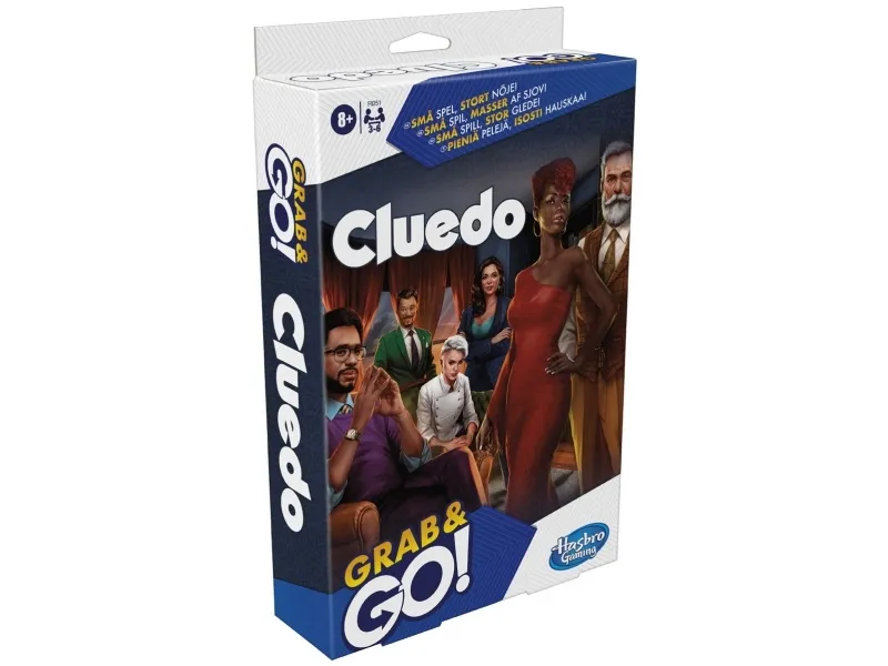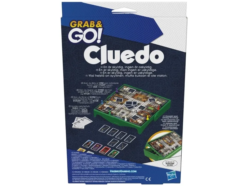 Ett mysterium måste lösas! Lek detektiv på språng med det kompakta Cluedo Grab and Go-spelet, med samma klassiska Cluedo-spelregler i reseformat! Vem dödade värden på den förnäma festen? Var begicks mordet och med vilket vapen? Minispelplanen inkluderar rum och hemliga gångar så att spelarna kan gå runt spelplanen snabbare. Deckarna kan hålla koll på ledtrådarna i sina detektivblock och lösa fallet! När ni har löst fallet kan ni förvara alla korten och delarna i den kompletta spelenheten. Tills nästa mord! Det bärbara resespelet för 3–6 spelare från 8 år är perfekt för att spela Cluedo Grab and Go så gott som var som helst. Hasbro Gaming och alla relaterade namn är varumärken som tillhör Hasbro.
