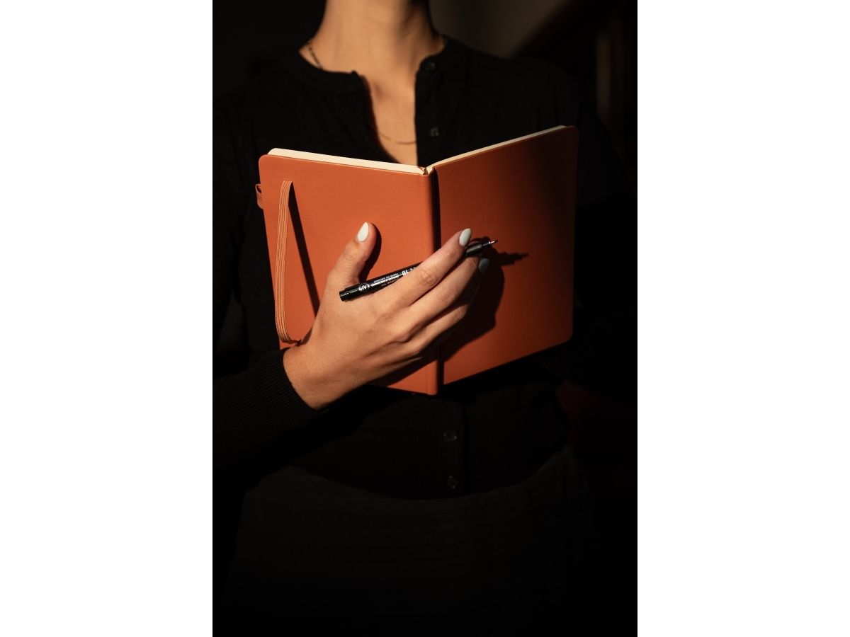 The Sakura ruled hard cover notebook is a high-quality journal. The notebook has 80 sheets of FSC-certified paper, slightly cream white coloured for optimal legibility. The classic line spacing (7 mm) ensures comfortable writing with enough space to easily re-read your handwriting. The sturdy 140 g/m2 acid-free paper for note making and record keeping is virtually suitable for any type of pen ink, ensuring that your writing does not bleed through. The Sakura notebook consists of an amber-coloured hard cover with rounded corners, an elastic closure band, a bookmark ribbon and an expandable pocket in the back for collecting loose notes.