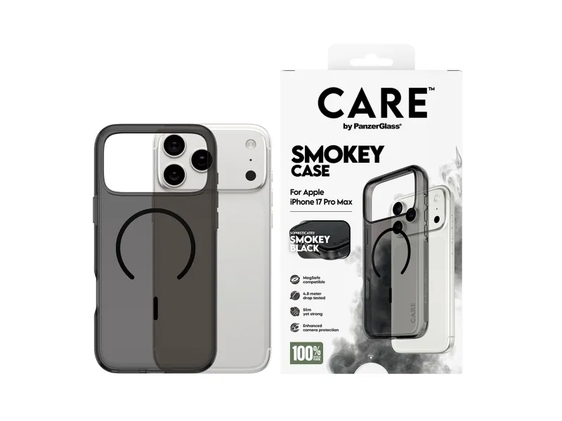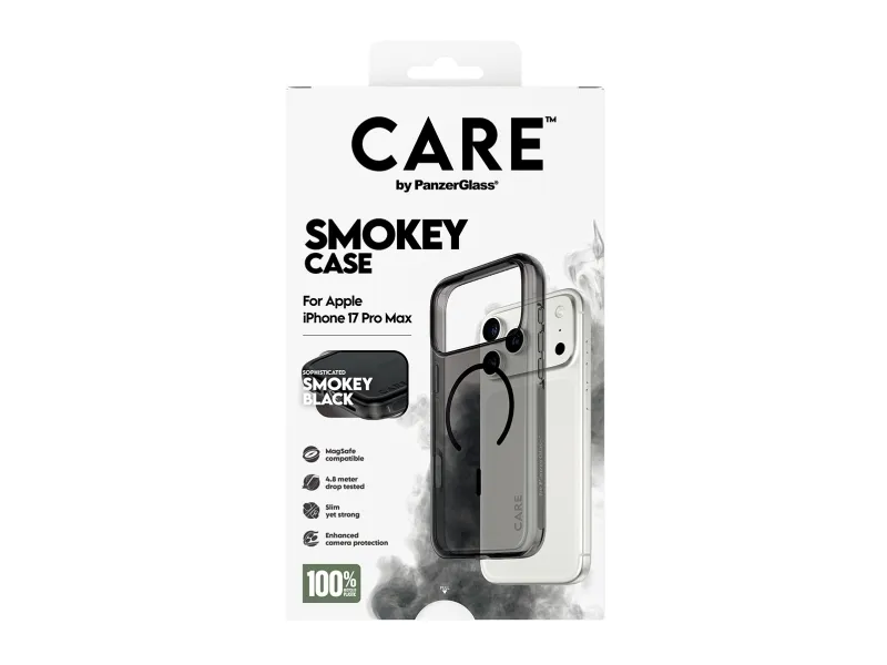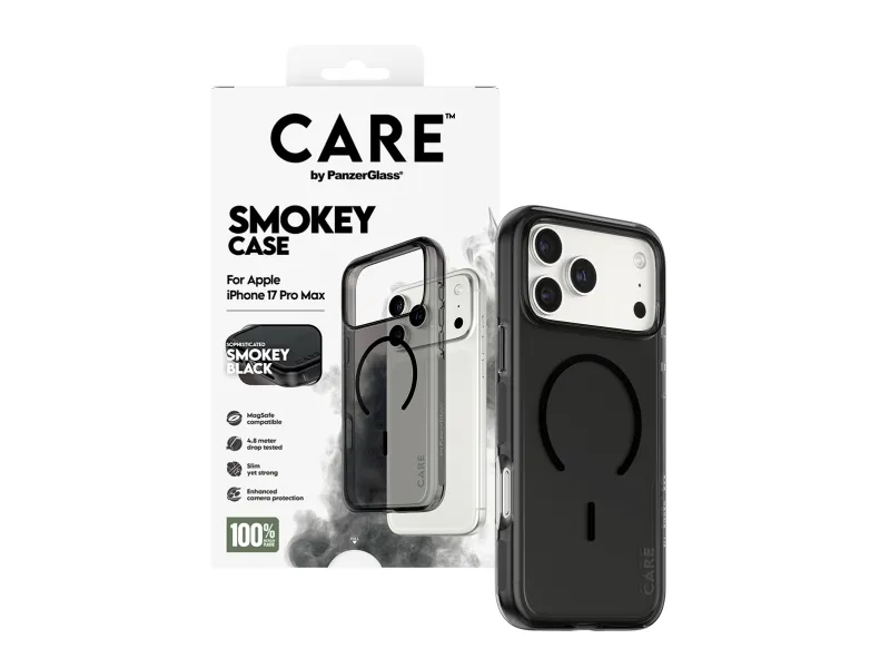 CARE is a playful and protective international tech and lifestyle brand featuring a range of products created using the highest quality materials and influenced by fashion, art, and music. We care about people and the world we live in. We care about sustainability and self-expression. And we care about tech and extending its lifetime. So protect your tech in style and show the world you CARE.PanzerGlass CARE by ® Flagship Case Urban Explorer Smokey w. Black MagSafe iPhone 17 Pro Max. Case type: Cover, Brand compatibility: Apple, Compatibility: Apple - iPhone 17 Pro Max, Product colour: Black