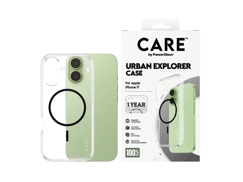 CARE is a playful, protective international tech and lifestyle brand featuring a range of products created using the highest quality materials and influenced by fashion, art, and music. We care about people and the world we live in. We care about sustainability and self-expression. And we care about tech and extending its lifetime. So protect your tech in style and show the world you CARE.PanzerGlass CARE™ by ® Urban Explorer Case Transparent w. Black MagSafe iPhone 17. Case type: Cover, Brand compatibility: Apple, Compatibility: Apple - iPhone 17, Product colour: Black