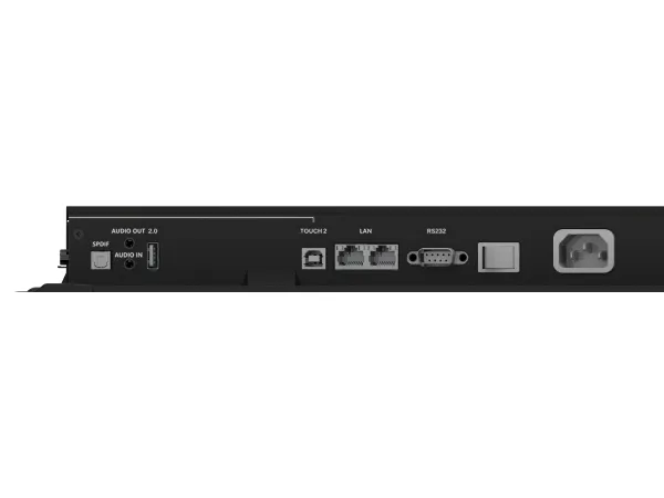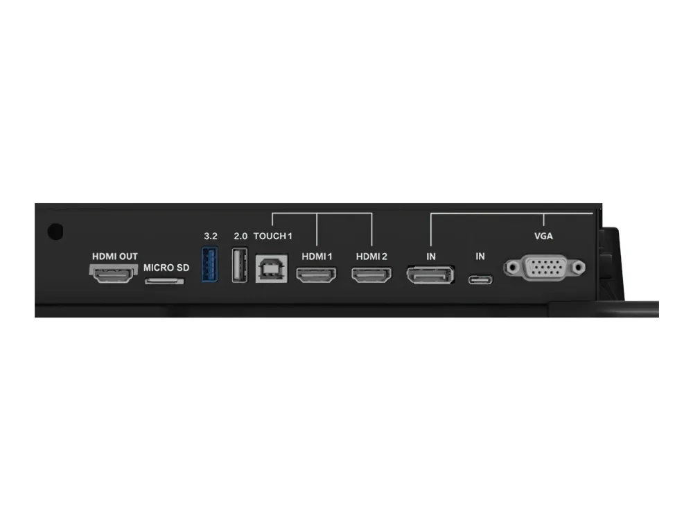 2 x HDMI-ingång DisplayPort-inmatning HDMI-utgång Beröring USB-C 2.0 VGA-ingång Ljudingång Ljudutgång USB 2.0 (endast för programuppdatering) SPDIF-utgång 2 x Gigabit LAN RS-232C-ingång USB-C 3.2 Gen 1 med DisplayPort 1.2, pekskärm, 65W strömförsörjning USB 3.2 Gen 1