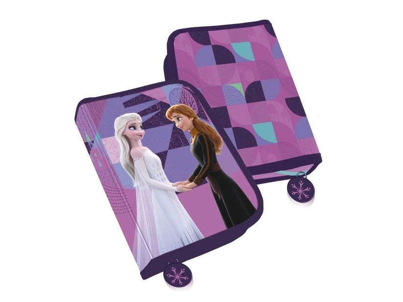 FROZEN Fylld enkel däckare pennfodral, 300D rik nylon, 20 x 12,8 x 3 cm. Innehåll: 8 triangulära vässade färgpennor, 1 triangulär vässad penna, pennvässare, 15 cm linjal, 1 stor suddgummi 13 x 4,5 x 1 cm. Förpackad stängd/dragkedja i polybag.