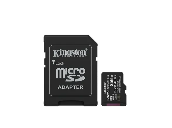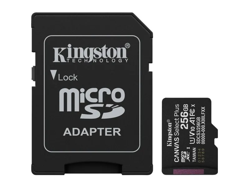 For peace of mind, cards are extensively tested and proven to be waterproof, temperature proof, and X-ray proof.***Kingston Technology 256GB microSDXC Canvas Select Plus Gen3 150MB/s A1 Card + Adapter. Capacity: 256 GB, Flash card type: MicroSDXC, Flash memory class: Class 10, Internal memory type: UHS-I, Read speed: 150 MB/s, UHS Speed Class: Class 1 (U1), Video Speed Class: V10. Product colour: Black