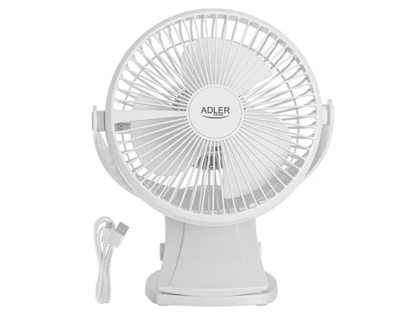Rechargeable 3.7V, 3000mAh battery Diameter: 15cm. 3 fan speeds. 360° adjustable tilt angle. 360° rotating head. Wall hanging hole 2 in 1 fan: desktop and clip-on fan 100cm cable with USB Type-C port