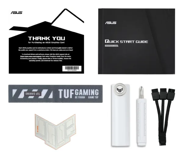 3 x 8-stift till 12VHPWR-kabel, TUF-kardborreband, tack-kort, TUF Gaming grafikkortshållare, TUF magnet, TUF Gaming-certifikat