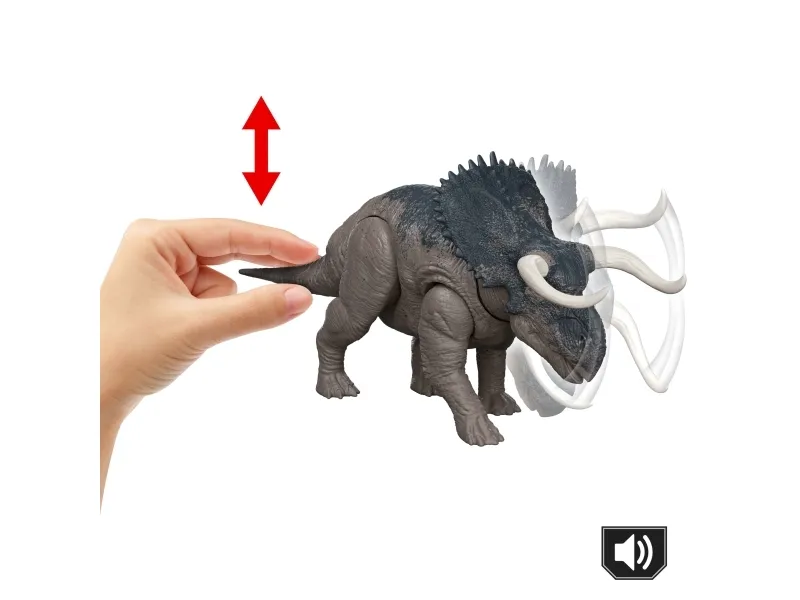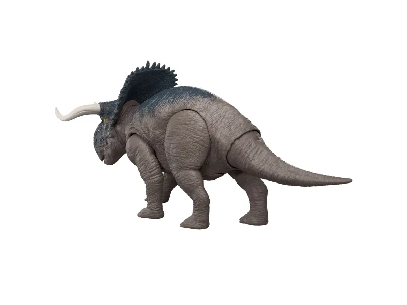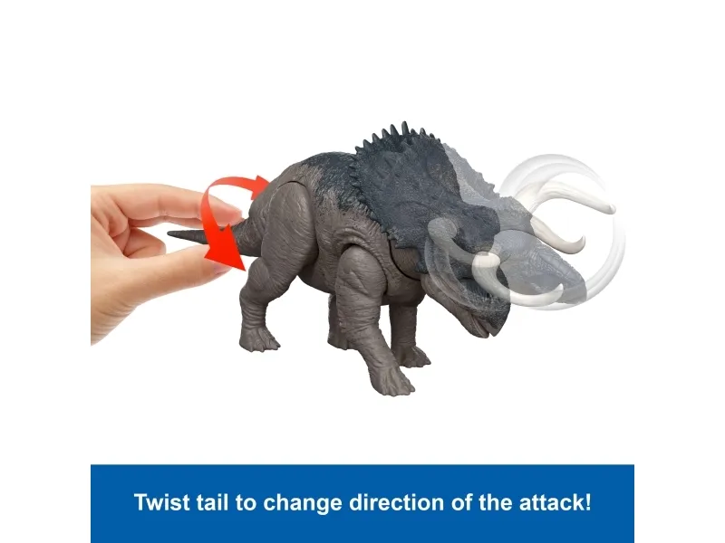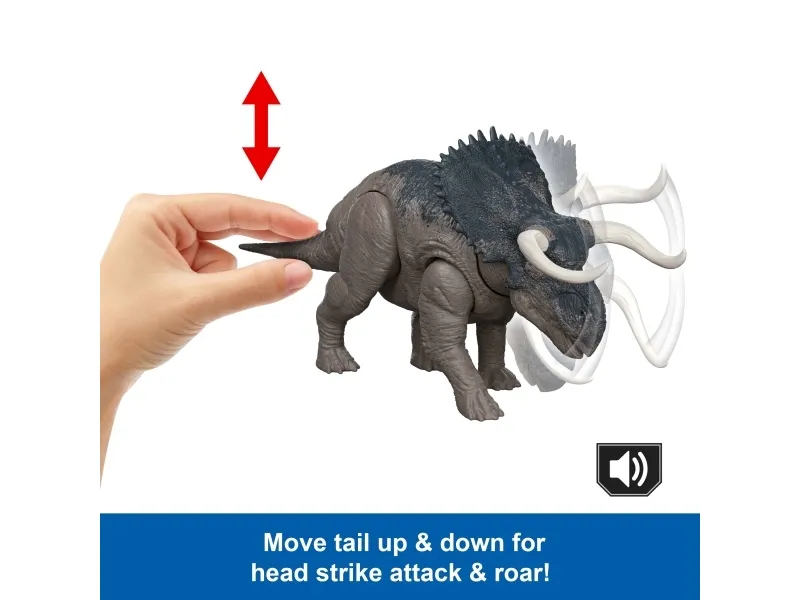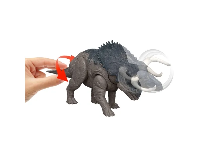 Get roaring and ferocious with this Wild Roar Nasutoceratops inspired by Jurassic World Rebirth. It's a Total Attack -- kids can easily move the tail up and down on this dinosaur toy to activate a thrilling attack motion, accompanied by a savage roar, then twist the tail to change the direction for thrilling battle play! This 12-inch long movie-inspired figure has movable joints, ready for exciting play or display. Scan the Tracking Code on the dinosaur's foot in the free Jurassic World Play App with a compatible smart device (Android or iOS, not included) to unlock a digital version of the dinosaur and play the fiercely fun game to race various vehicles on land, air and sea. This Nasutoceratops makes a great gift for dinosaur fans ages 4 years and up. Colours and decorations may vary.Jurassic World Rebirth Wild Roar Nasutoceratops Dinosaur Toy, Tail Controlled Attack Chomp & Sound. Recommended age (min): 4 yr(s), Product colour: Multicolour, Material: Plastic