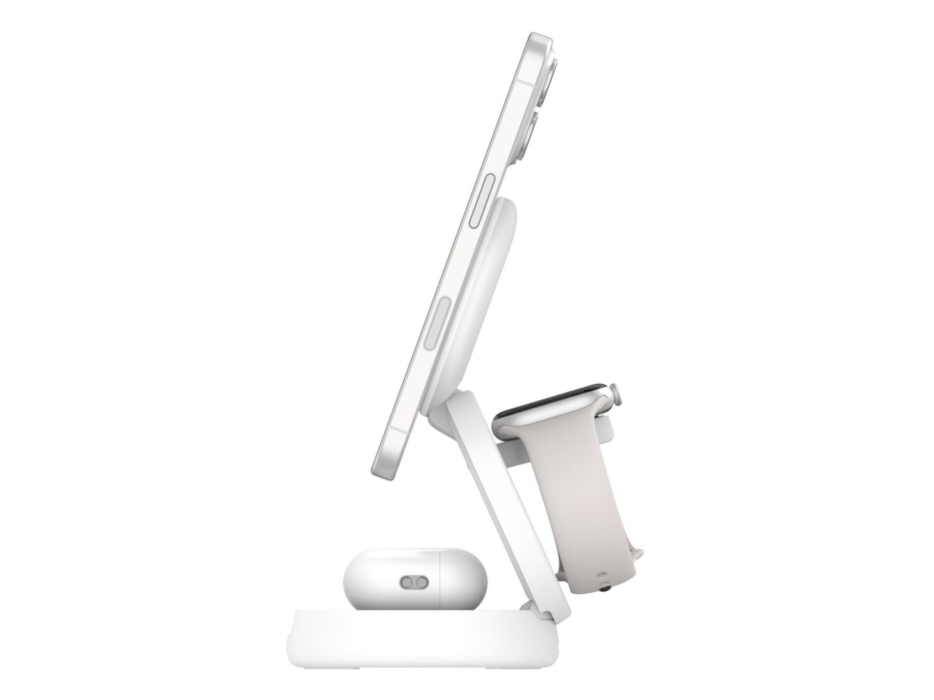 Laddar samtidigt upp till 3 enheter, stående/liggande orientering, vikbar, magnetisk justering, kompakt design, 65° justerbar synvinkel, funktion för vänteläge