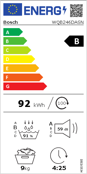 The Bosch Serie 8 WQB246DASN dryer combines efficiency and advanced technology, ensuring laundry is handled with care. Featuring an LED display, this electric dryer has a maximum drying capacity of 9 kg and utilizes a heat pump drying method for energy efficiency. With a range of drying programs, including options for delicate fabrics, bedding, and sportswear, this dryer is designed to cater to diverse laundry needs. Equipped with a moisture sensor and various customizable programs, the Bosch Serie 8 allows optimal drying based on load size and fabric type. The dryer also features an interior light, lint filter, adjustable feet for leveling, and child security for safety. With Wi-Fi capability, control via a smartphone app, or voice commands through Alexa, laundry management becomes modern and convenient.