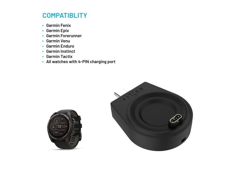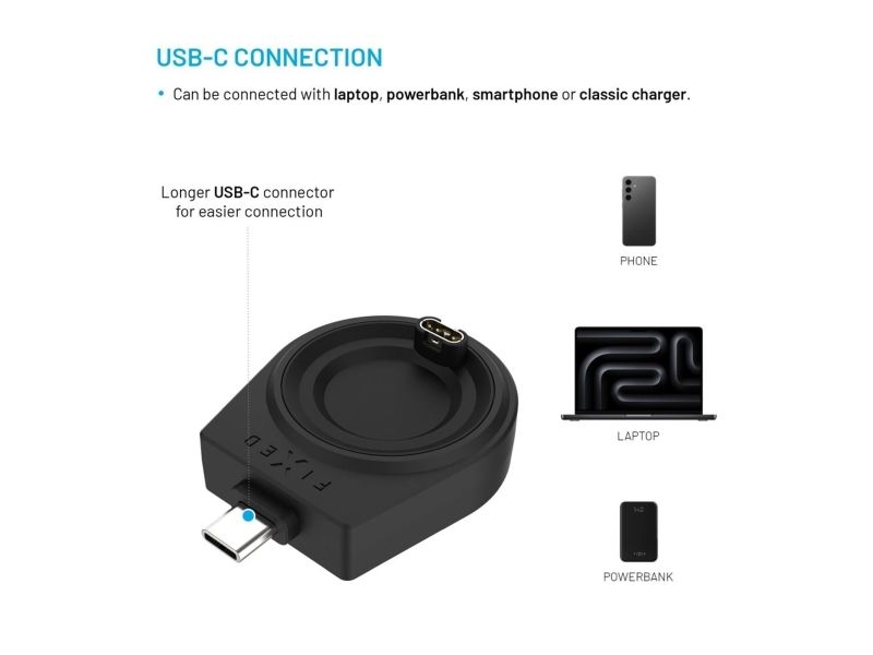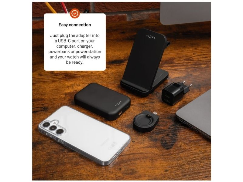 The FIXED charging adapter is designed for smart watches, offering an efficient and convenient way to keep your device powered. With a compact design crafted from durable ABS plastic, this power adapter provides a stable output of 2.5 W, ensuring timely charging for your wearable technology. The 24-pin USB-C input connector is easy to use and supports a range of smart watches, making it a versatile addition to your tech accessories.