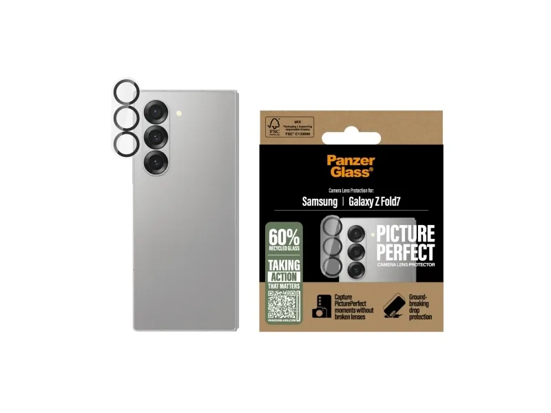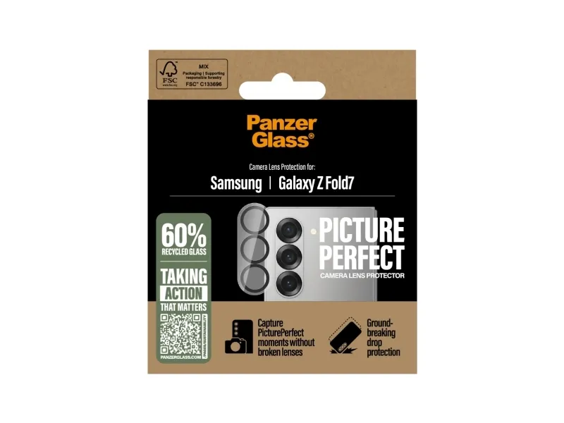 The latest smartphones feature increasingly powerful camera systems. However, all this advanced technology amounts to nothing if you scratch or crack your lenses that would leave permanent scars on future photos. With the PanzerGlass PicturePerfect Camera Lens Protector, your camera lenses are safe from accidental drops on stone-hard floors, bumps against sharp corners, and the screeching kiss of keys in your pocket. And if you're worried the extra protection will cause image distortion, you can rest easy: this camera lens protector doesn't affect the clarity of your lenses or the quality of your photos – it just gives you a bit more peace of mind. The PicturePerfect Camera Lens Protector protects and prolongs the lifetime of your phone so that one day you can pass it on to someone else who will love it just as much as you do. This is one way of working toward a more sustainable future. Another is to use less packaging: For this camera lens protector, we have managed to reduce the paper packaging by 37%* compared to previous models. So, of course, this product comes in a recyclable FSC-certified box.*Measured by comparing the mass of the 2023 paper packaging with the mass of the 2022 paper packaging. Measurements performed by third-party lab (CPRTC, report No. ZSA20231301-0016).