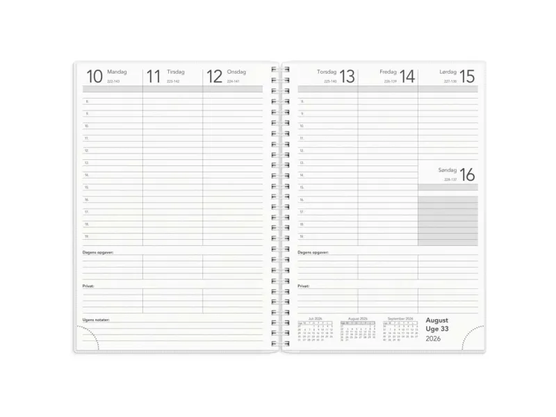 Simpel ugekalender i et enkelt design. Kalenderen er spiralbundet med et omslag i PP-plast og har en grå forside med årstal. Basiskalenderen er inddelt med en uge pr. opslag og indeholder et timeopdelt kalenderskema fra kl. 8-19, så du nemt kan overskue ugens planer og aktiviteter. Dertil finder du nederst på hver side plads til dagens opgaver, ugens notater, private aftaler og aktiviteter samt en lille 3 måneders oversigt.