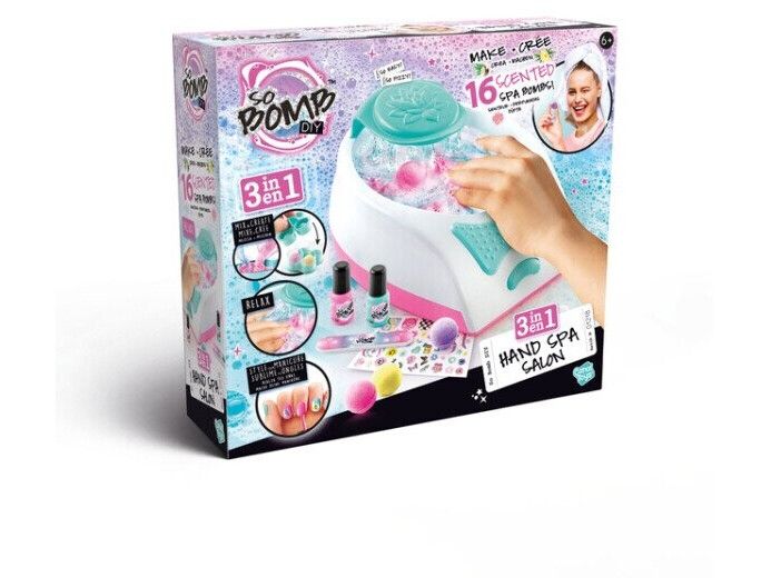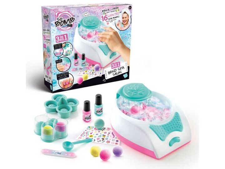 Upplev den här otroliga 3-i-1 handspa salongen! Salongen innehåller en elektronisk handspa-apparat, allt det du behöver för att göra 10 stycken lugnande badbomber med avkopplande doft plus ett manikyrset som ger dig perfekta naglar. Perfekt för skojiga lekar med vännerna, till pyamasparty eller födelsedagar. Från 6 år.