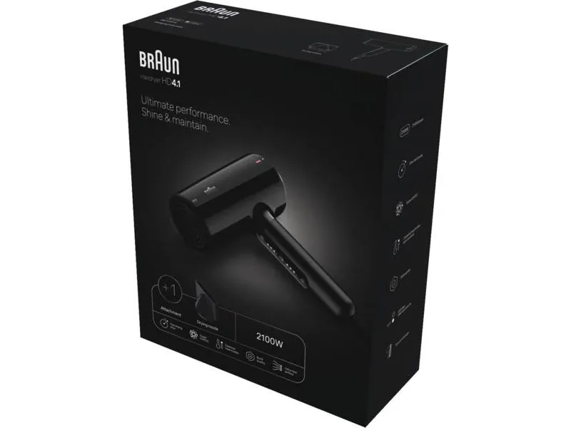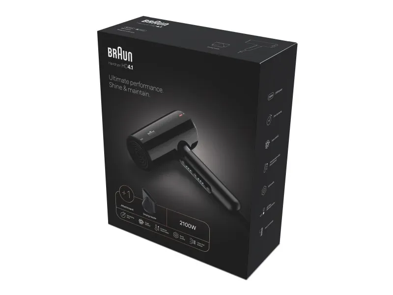 Braun HD4.1. Product colour: Black, Surface coloration: Monochromatic, Cord length: 2.2 m. Power: 2200 W. Quantity per pack: 1 pc(s), Package width: 250 mm, Package depth: 301 mm