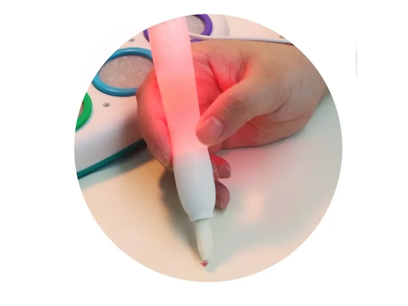 Du kan "doppa" den magiska ljuspennan i en av färgerna, och pennan lyser upp i den färg du har valt – nu kan du måla färgen på det magiska pappret.
