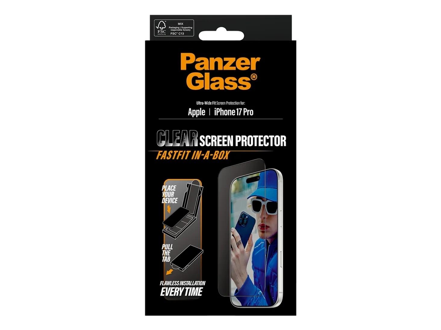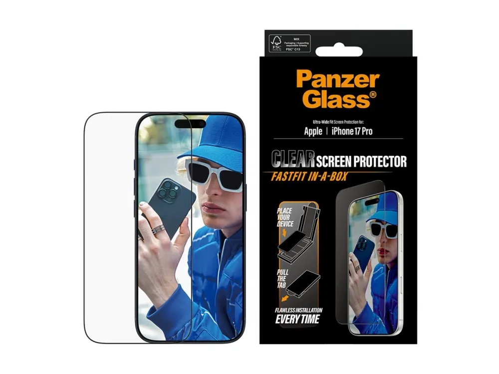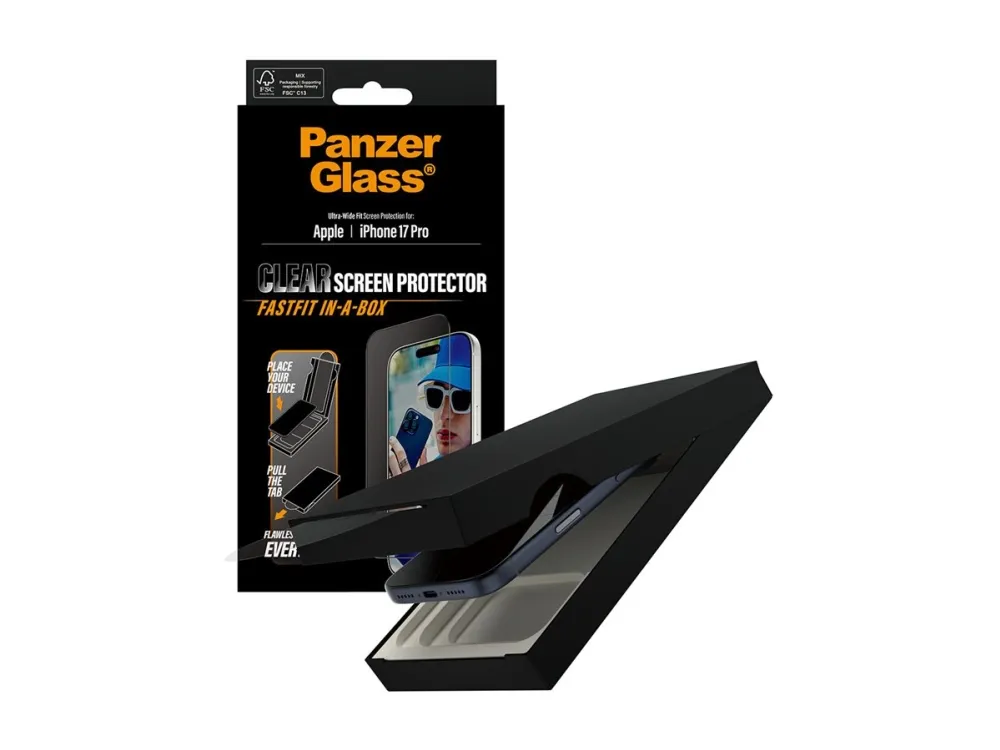 FLAWLESS INSTALLATION EVERY TIME. Installation has never been easier with the new  FASTFIT IN-A-BOX system. Say goodbye to alignment issues and dust intrusion. Simply place your phone face-up, pull the tab, and enjoy a flawless installation every time.This PanzerGlass screen protector, made of 60% recycled material, offers superior scratch resistance and outstanding shock protection. Protecting your phone from bumps, drops, and other everyday hazards with this screen protector, built to withstand impacts of all kinds. It even comes with a smudge-free coating that reduces fingerprints and grease, ensuring your screen stays crystal-clear.With an Ultra-Wide Fit, this screen protector covers the front surface of your phone, while making room for a case. For full protection, pair the screen protector with PanzerGlass PicturePerfect or Hoops camera lens protector, and a case from CARE by PanzerGlass .We've included step-by-step installation instructions as well as a QR code for quick access to our online how-to video. And remember: Once the screen protector is installed, you'll never again fear the sight of your phone tumbling to the ground screen first. This may not happen, but then again… it might!