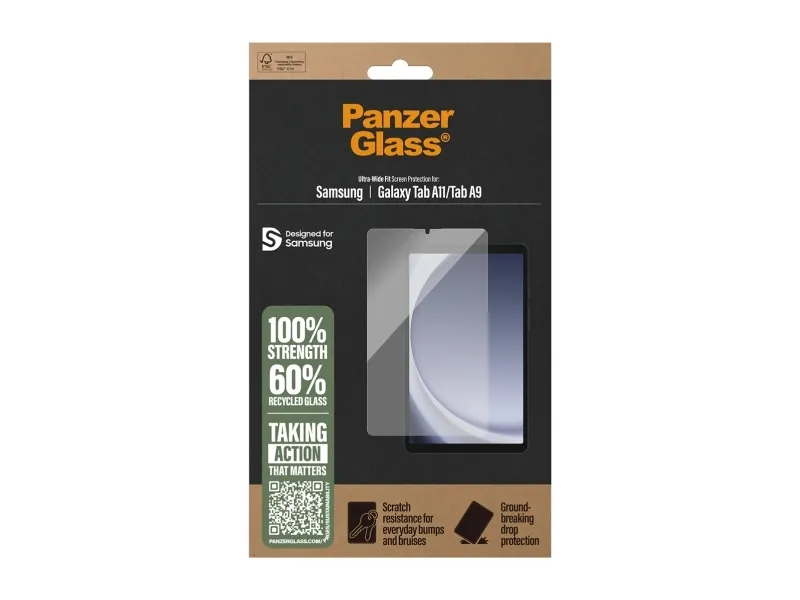 The PanzerGlass® screen protector. Tested by kids. Approved by parents.PanzerGlass ® Screen Protector Samsung Galaxy Tab A11 | Tab A9 | Ultra-Wide Fit. Brand compatibility: Samsung, Compatibility: Samsung - Galaxy Tab A9, Samsung - Galaxy Tab A11. Dry application. Protection features: Scratch resistant, Shock resistant. Material: Polyethylene terephthalate (PET), Silicone, Product colour: Transparent. Quantity per pack: 1 pc(s)