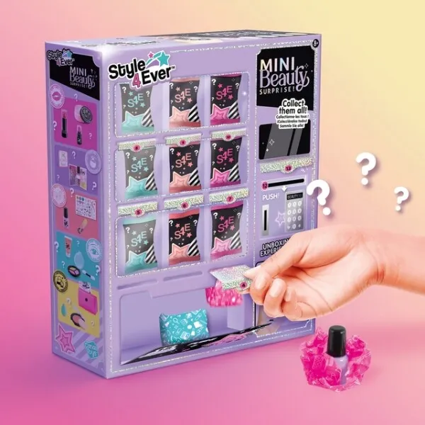 De trendigaste skönhetsgodbitarna är gömda i den här mini-skönhetsautomaten. Öppna den och packa ut den ena överraskningen efter den andra. Nagelöverraskningar, läpp- och ögonmakeup, sminkprover, vad tror du att du får? Varför inte samla dem alla? Från 8 år.
