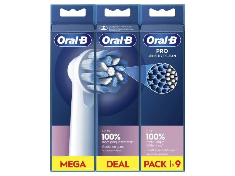 Oral-B Pro Sensitive Clean. Number of brush heads included: 9 pc(s), Product colour: White, Bristle stiffness: Extra soft. Weight: 49.05 g. Package width: 180 mm, Package depth: 18 mm, Package height: 220 mm